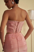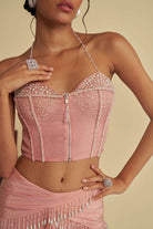 This beautiful drape saree with pearl beaded corset and finely attached chain on the neck that is constructed with crystals and pearl.