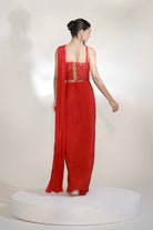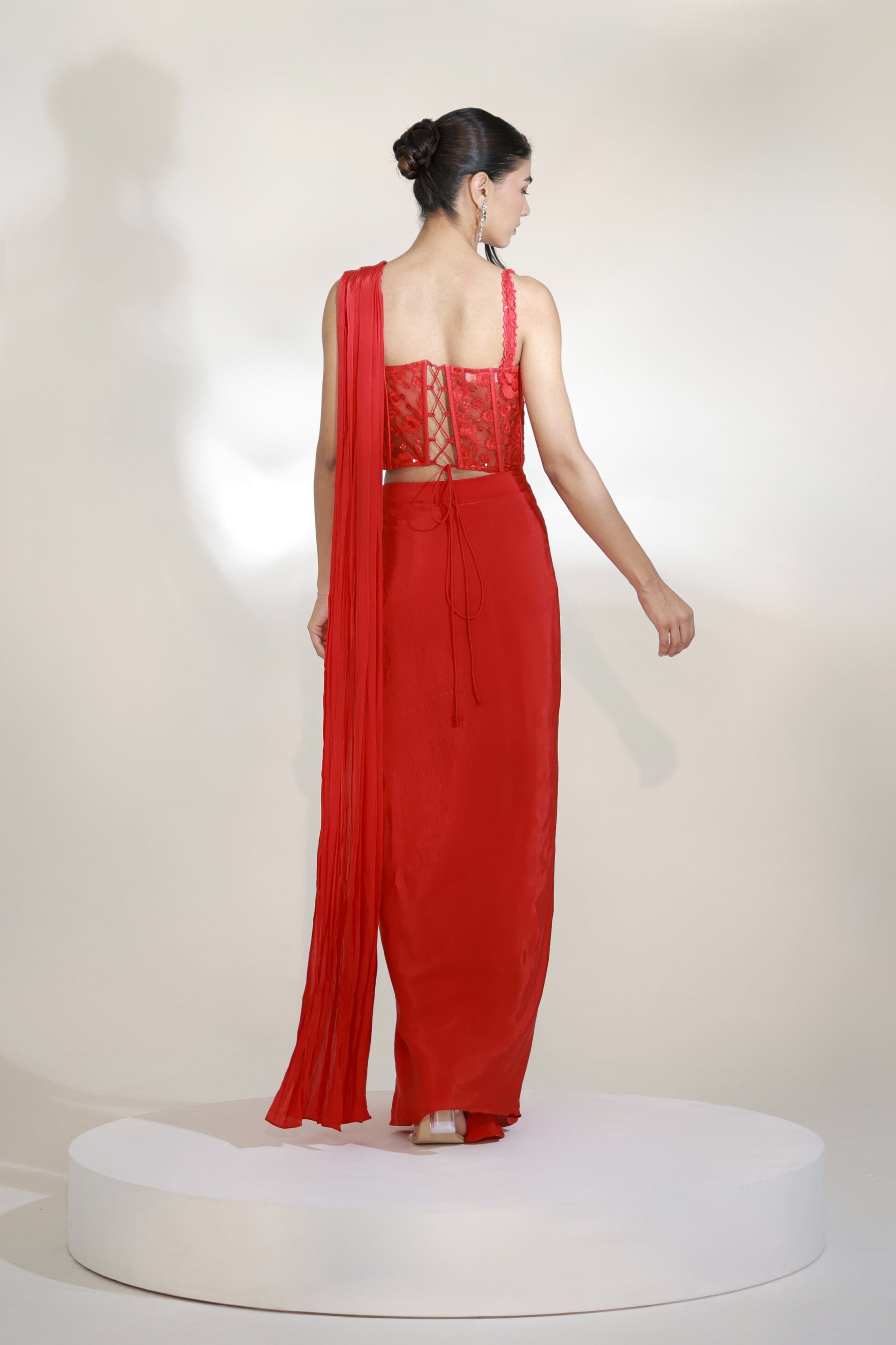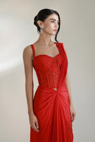 Command the spotlight in our red Corset Saree — a sculpted silhouette that marries structure with fluidity. Designed in luxurious fabric, the corset contours the body with precision, while the pre-draped saree cascades effortlessly for a modern, yet timeless appeal. With refined gathers and a cinched waistline, this ensemble is your go-to for elevated celebrations and unforgettable entrances.