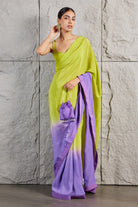 Lime green and lavender ombre crepe saree paired with lime green crepe blouse featuring sweetheart neckline in front and drawstring detailing at back.