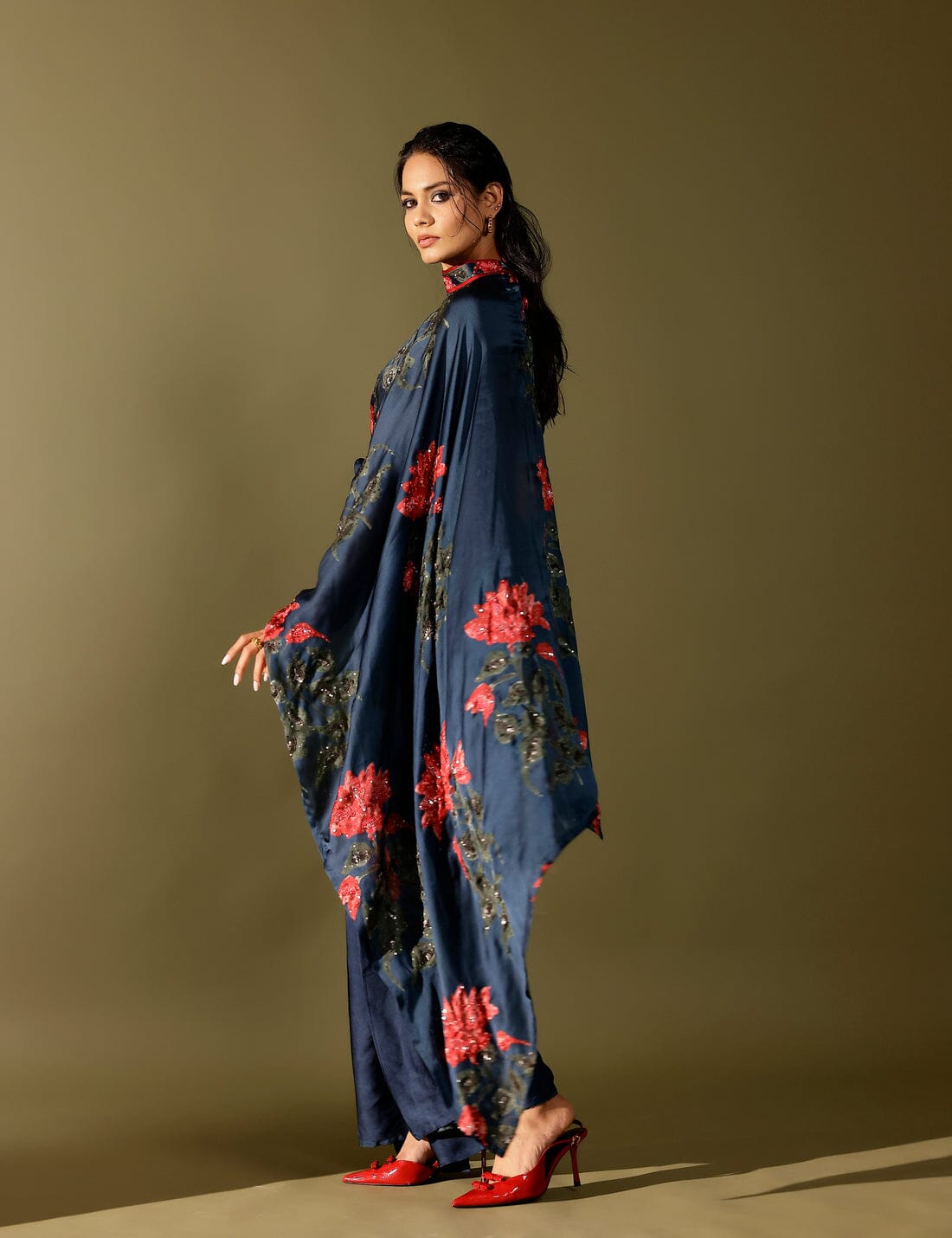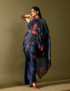 SareeThe timeless charm of a sari meets contemporary finesse in this ensemble. Featuring a pre-stitched georgette satin skirt with pleated waist, it flows seamlessly into our signature collared pallu in richly embroidered satin. Paired with a complementing blouse and an embellished belt, this three-piece look is perfect for weddings, receptions, or evening celebrations.