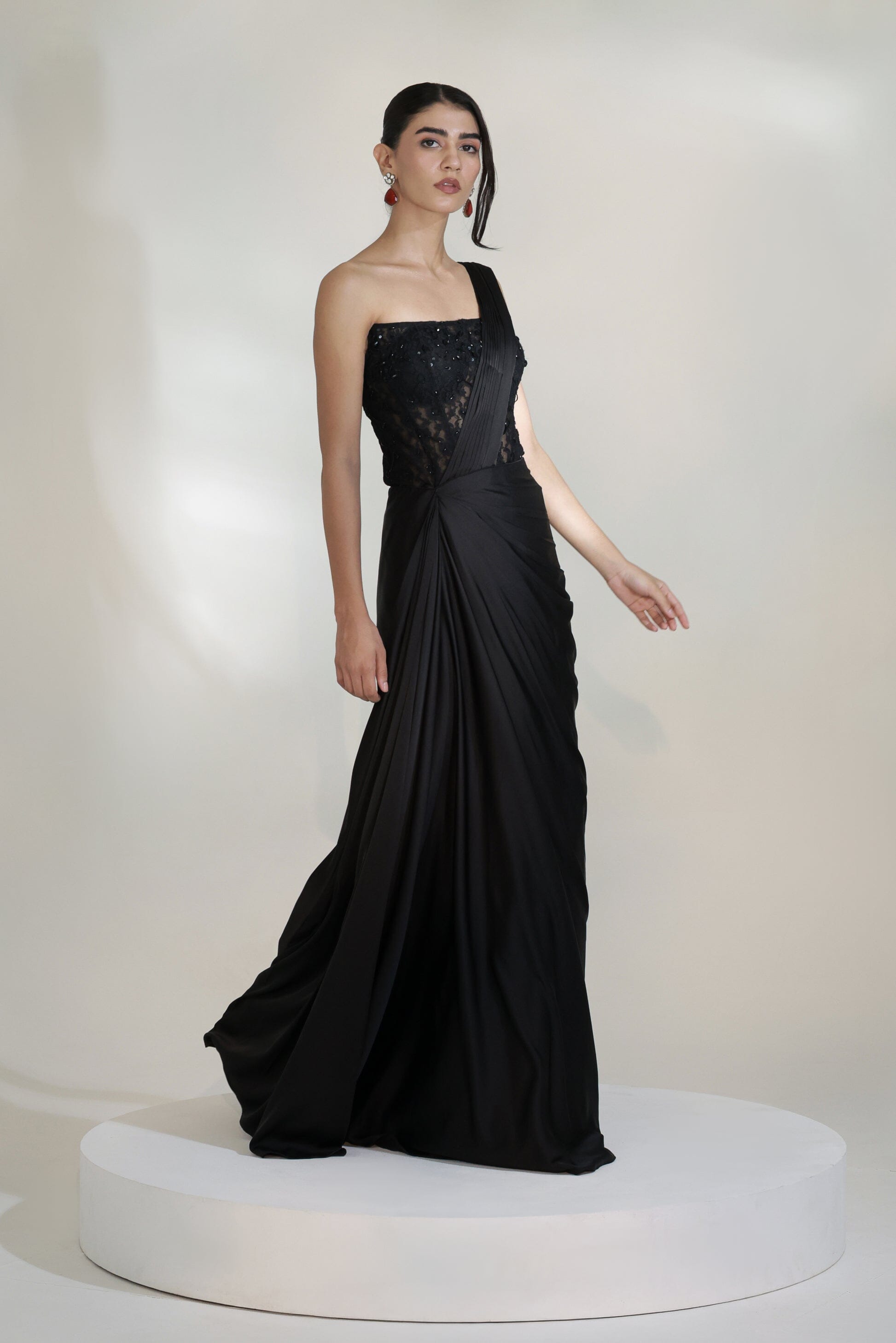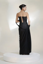 Command the spotlight in our BLACK Corset Saree — a sculpted silhouette that marries structure with fluidity. Designed in luxurious fabric, the corset contours the body with precision, while the pre-draped saree cascades effortlessly for a modern, yet timeless appeal. With refined gathers and a cinched waistline, this ensemble is your go-to for elevated celebrations and unforgettable entrances.