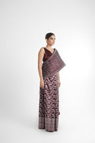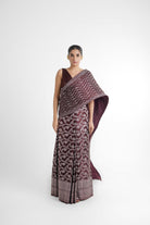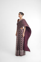 Sheena Banarasi Concept Saree in brown, features a pre stitched saree attached with a hand sculpted banarasi palla and a v neck blouse achieved with a skilful technique, This saree is a perfect pick for your evening soiree, weddings.