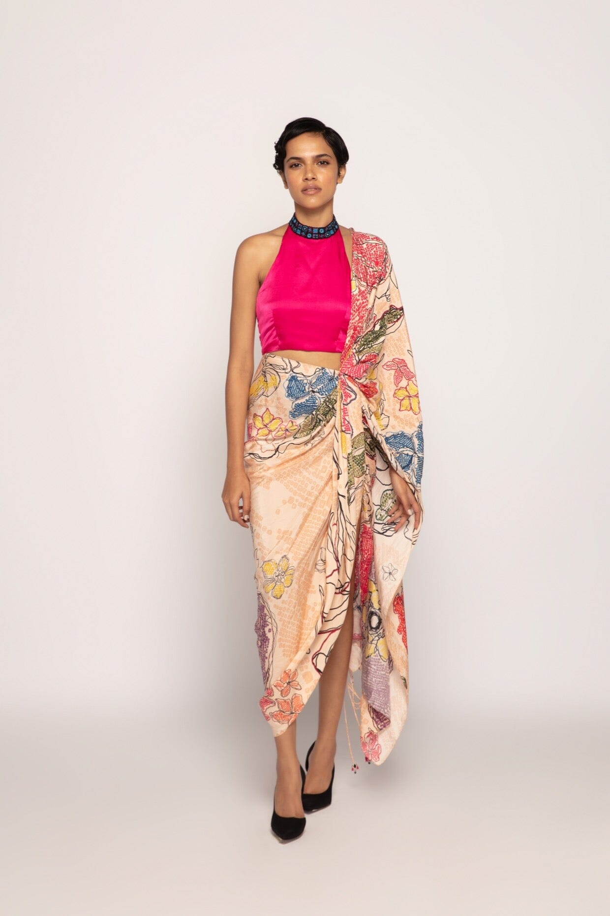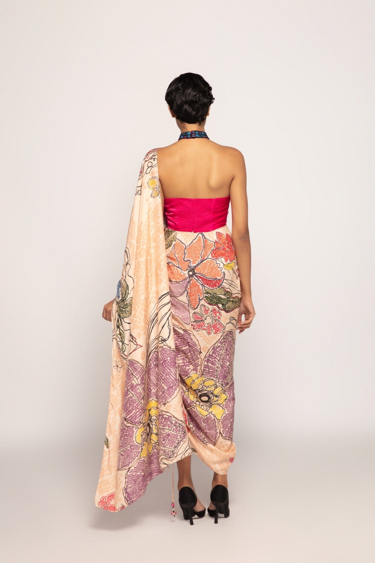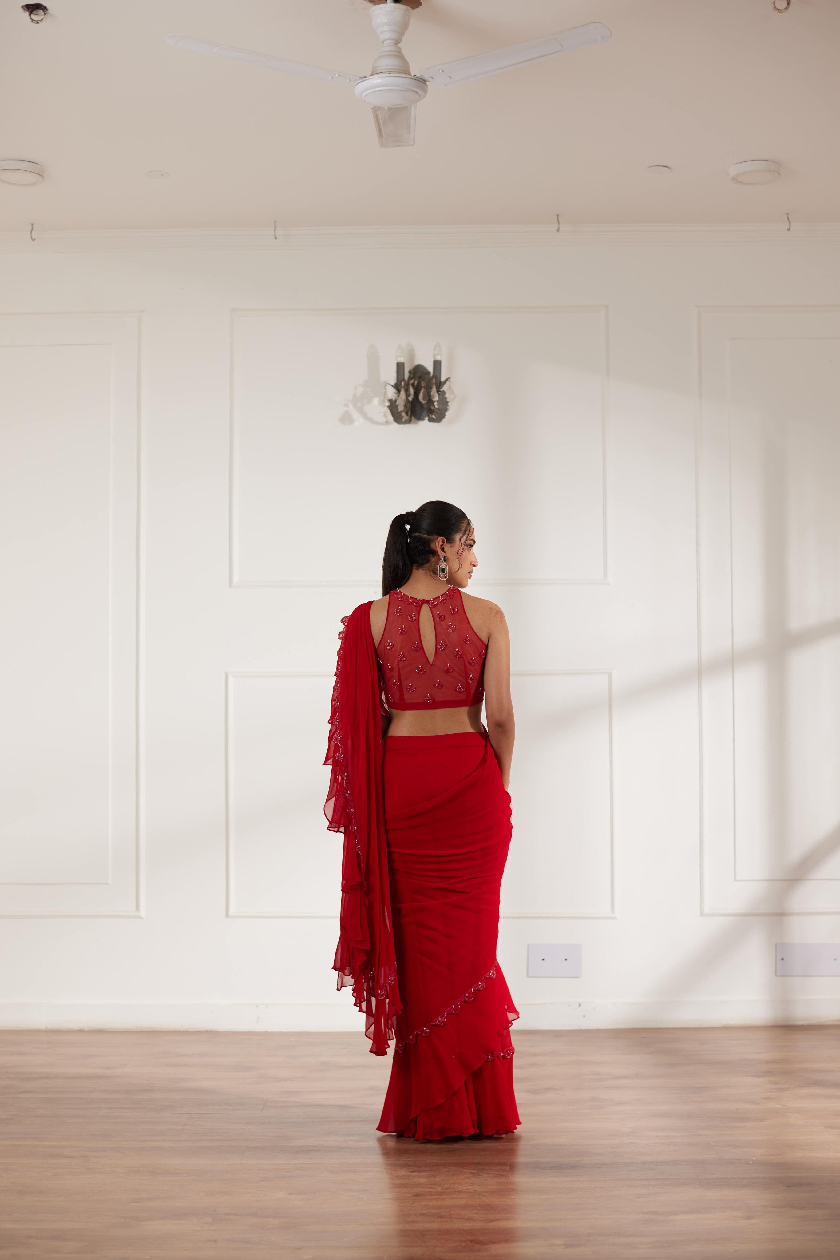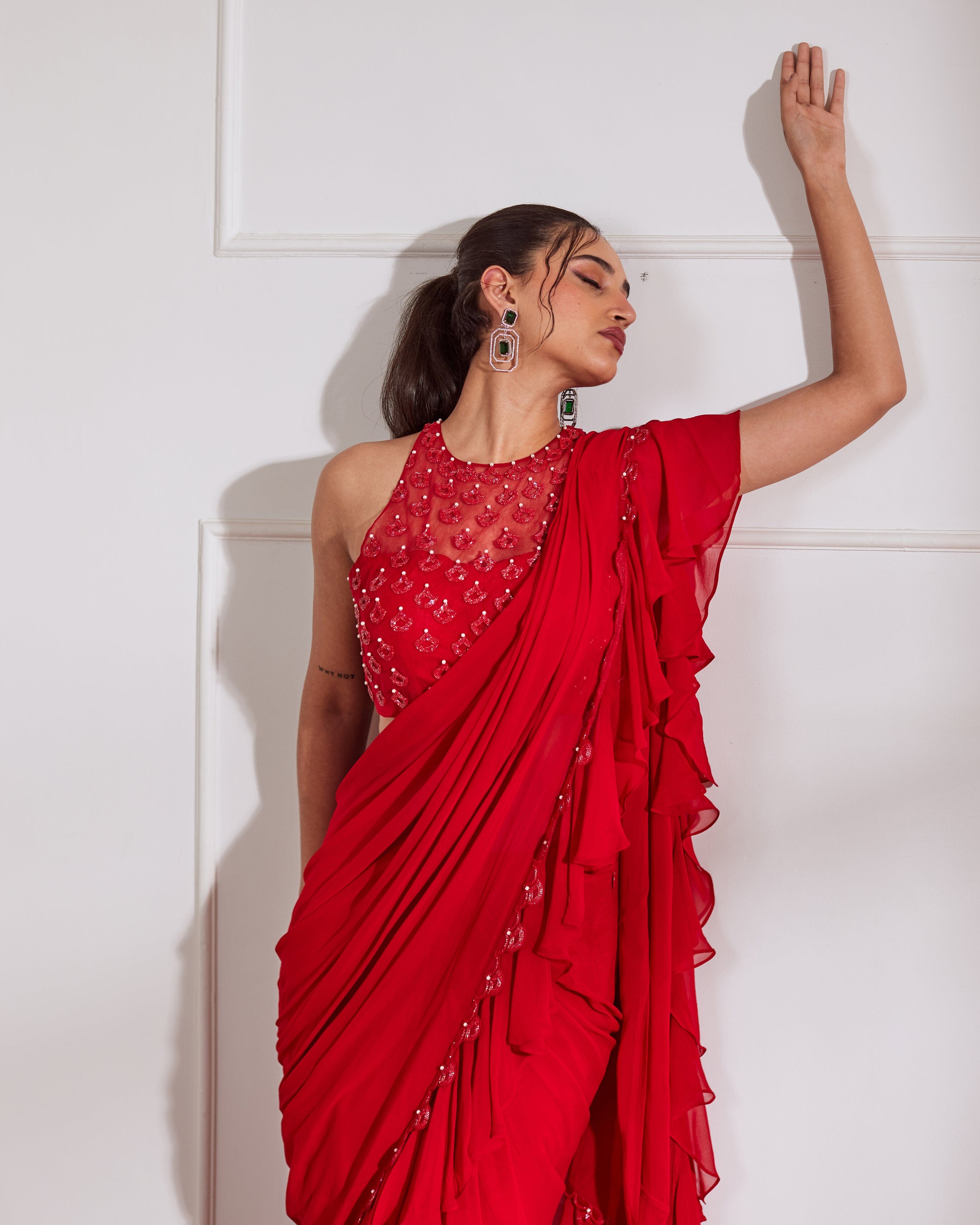 Bottle Green One Shoulder Blouse With Pre Draped Saree And Belt