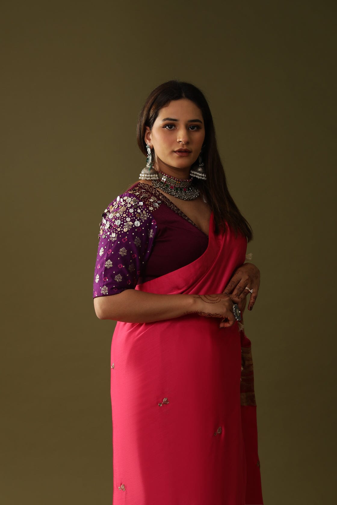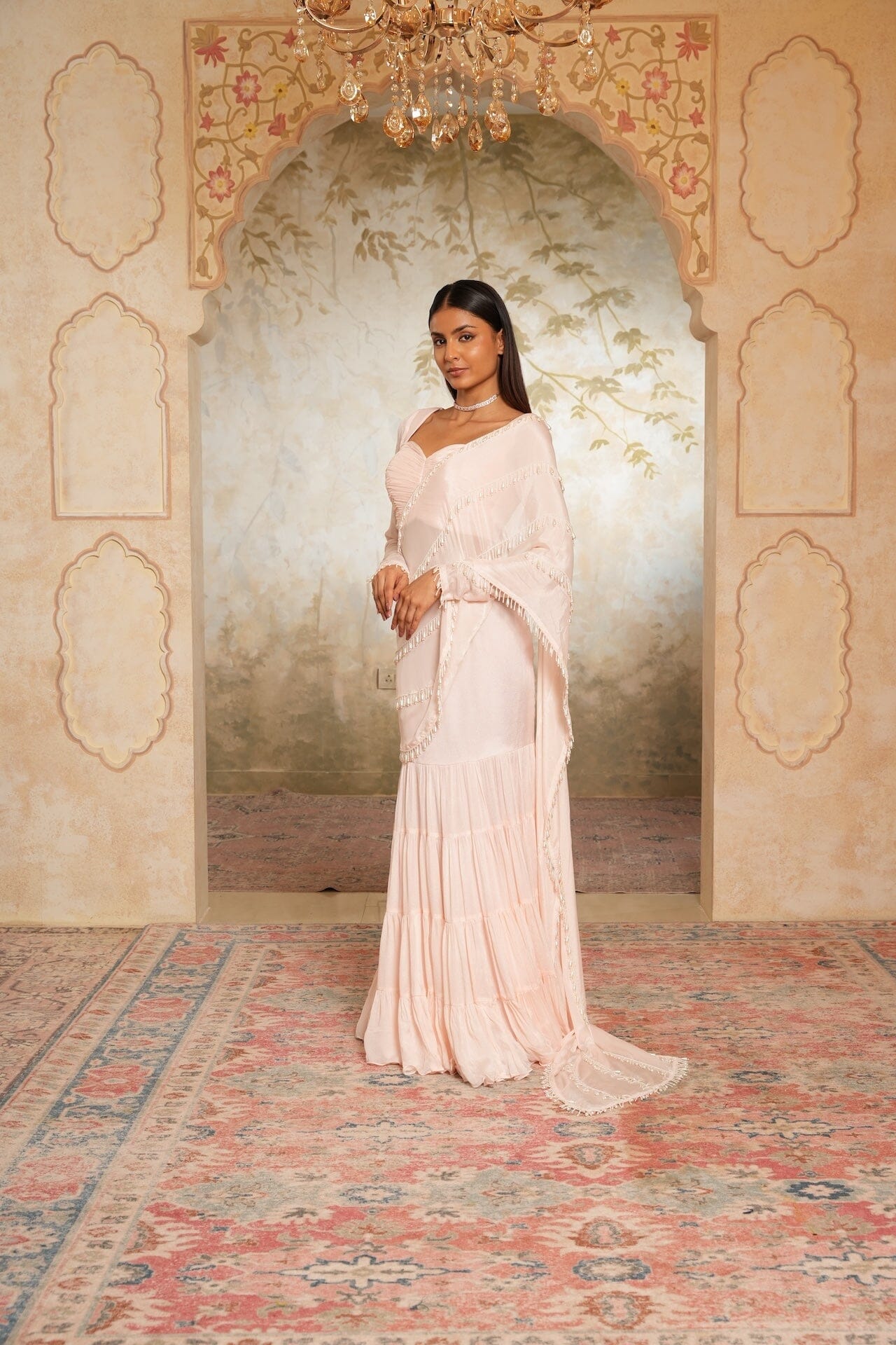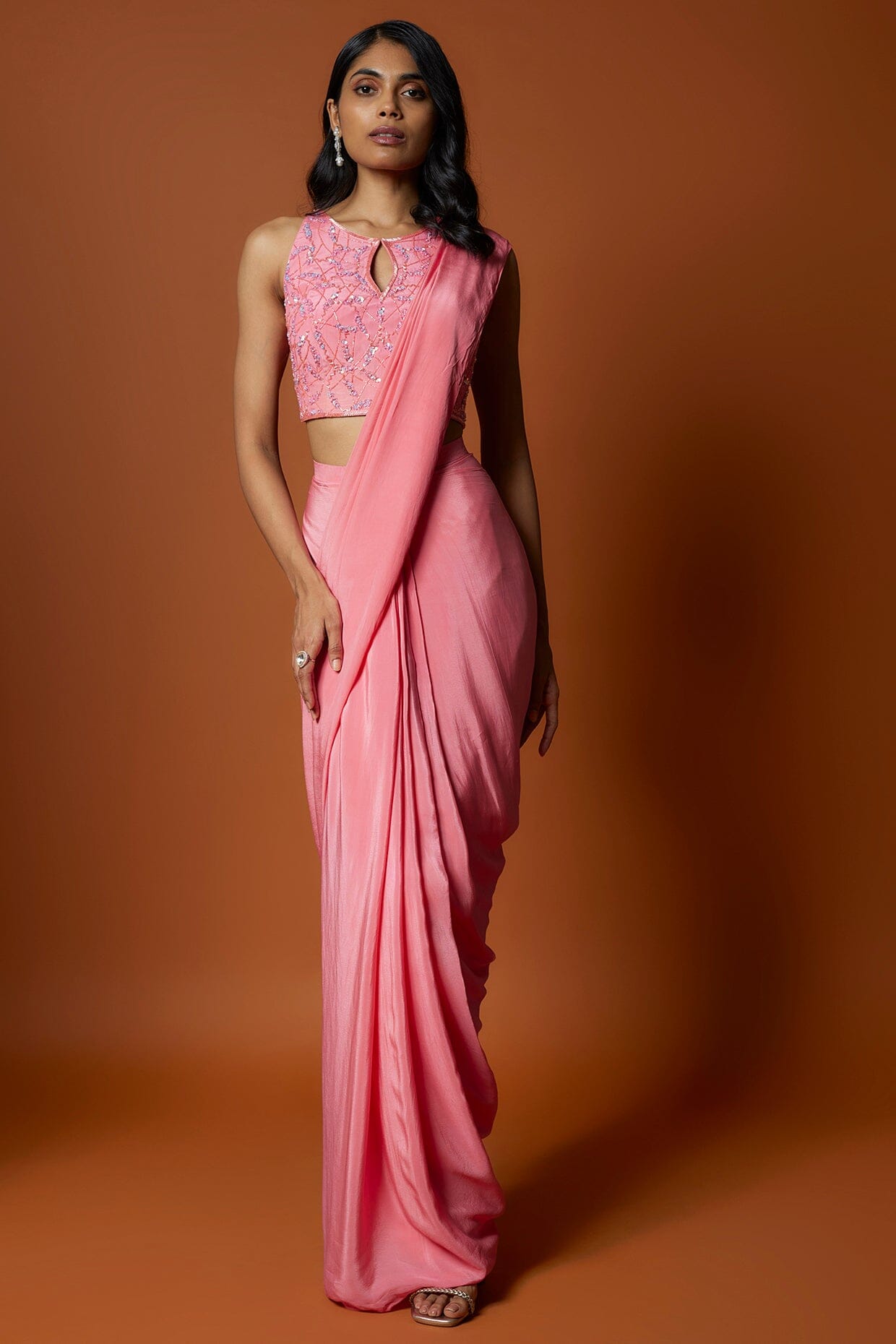 Coral Pink Pre Draped Sari Set