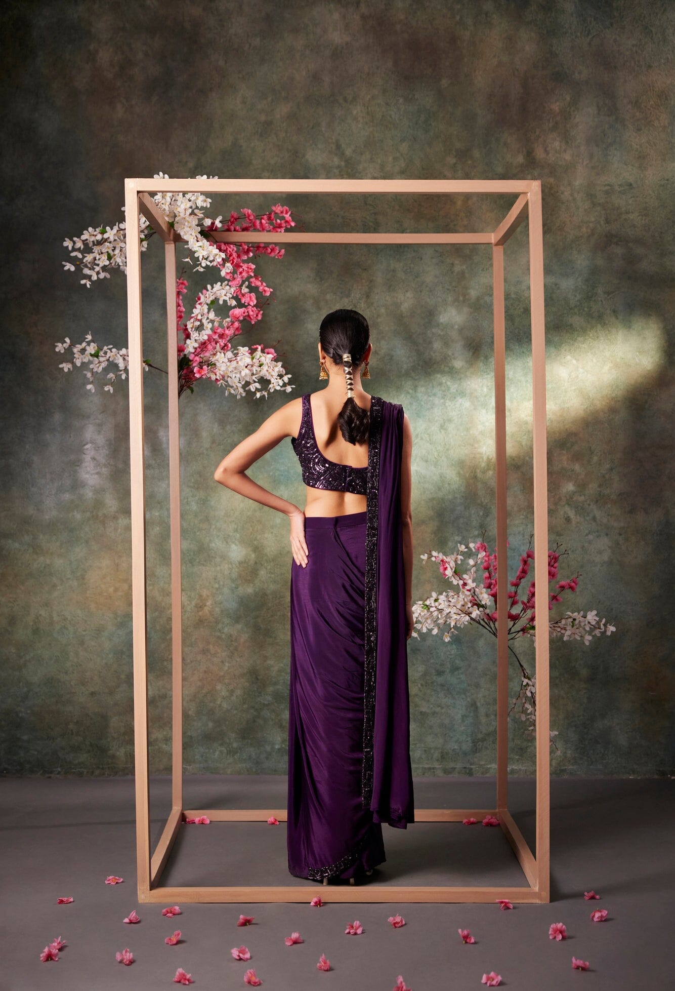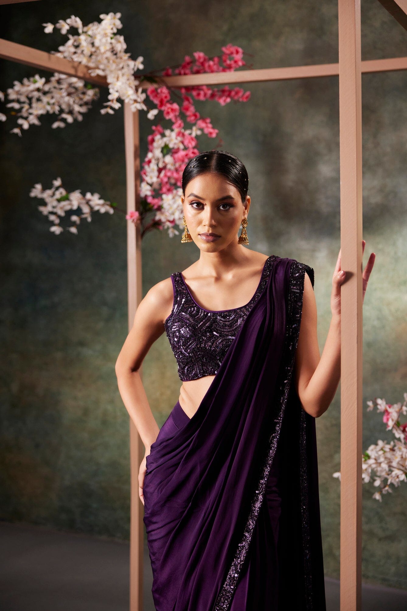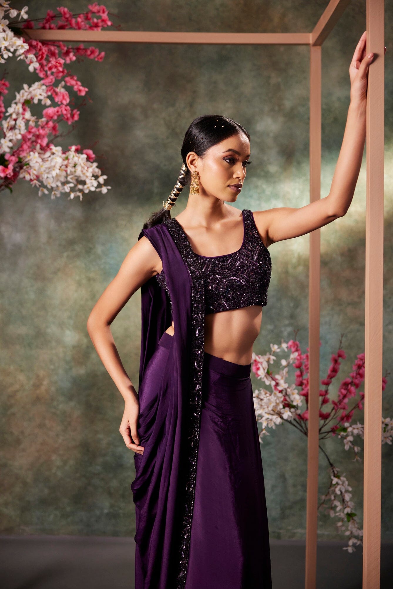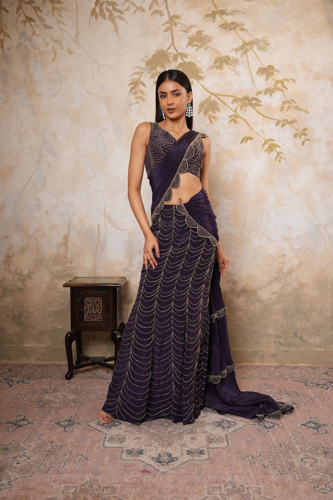 Purple Pre Draped Saree Set