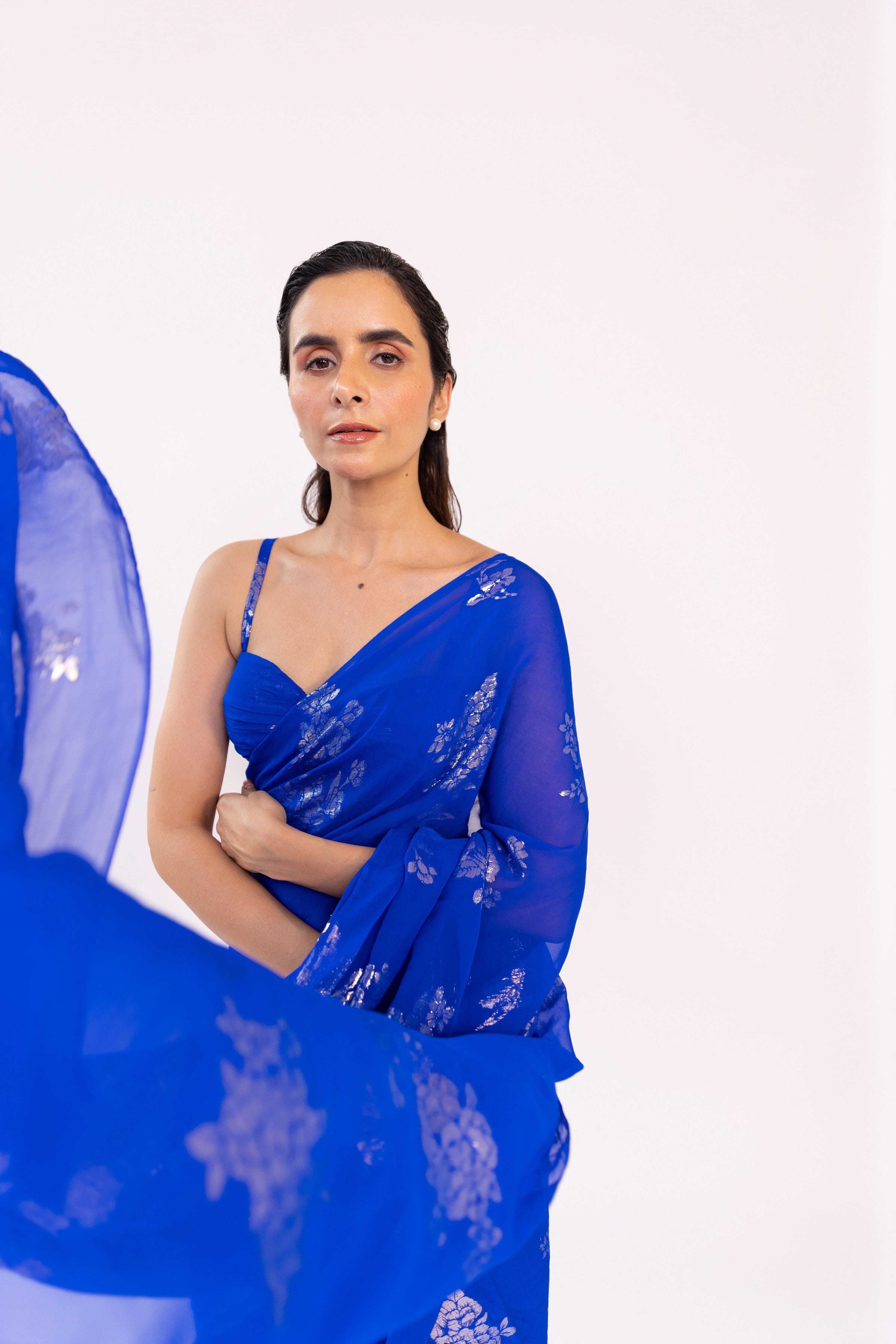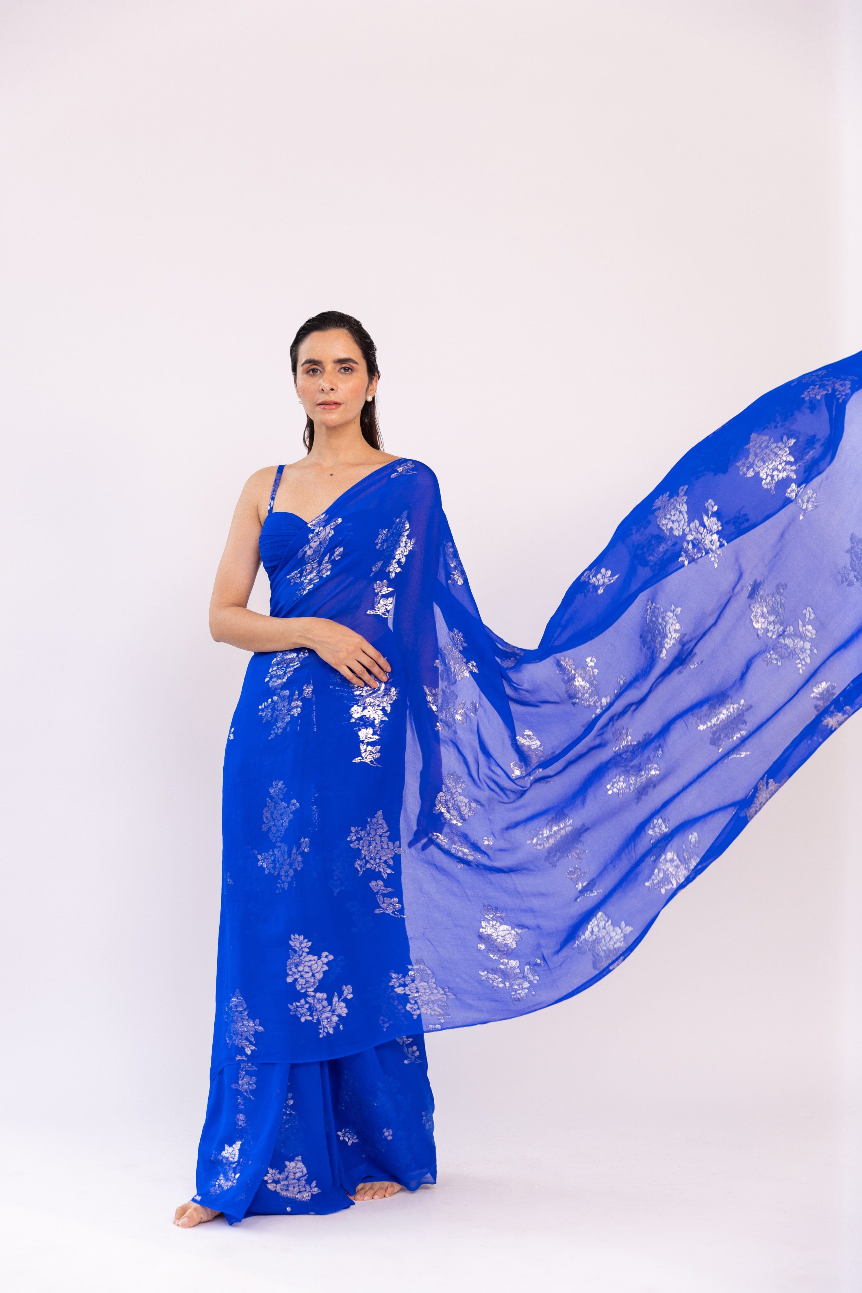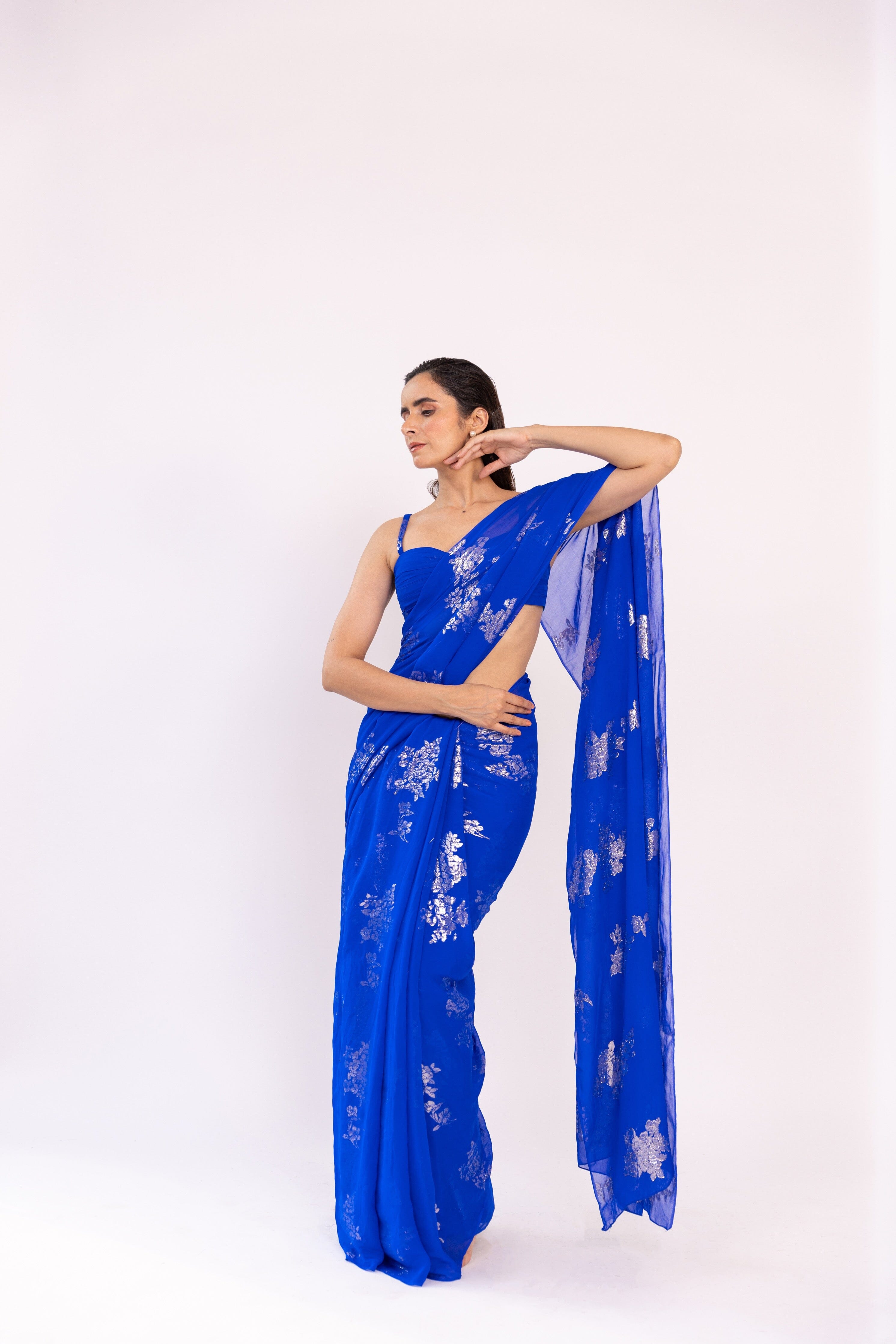 Featuring a royal blue pre-stitched saree in gorgette lurex base. It is paired with a strappy bandeau blouse.