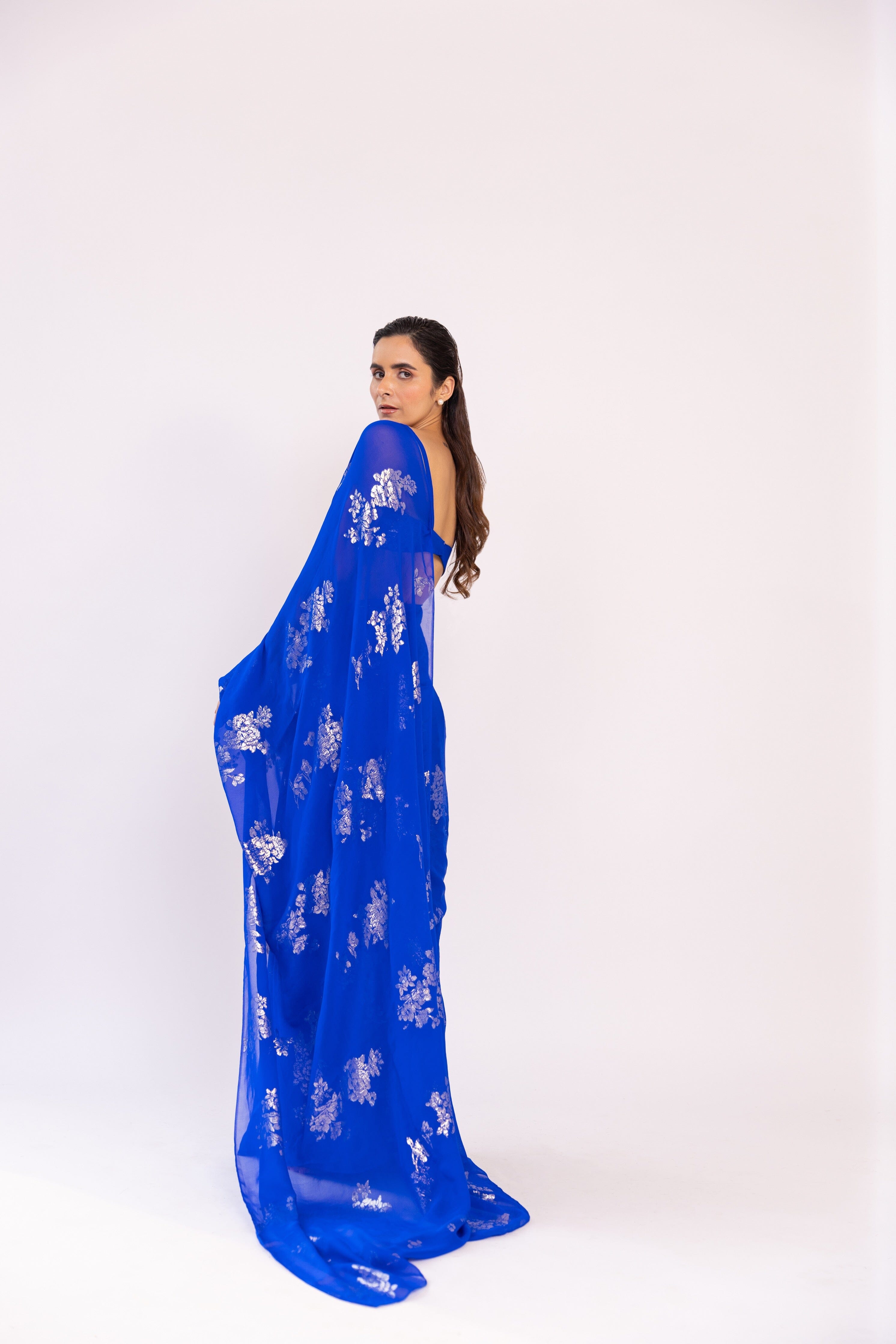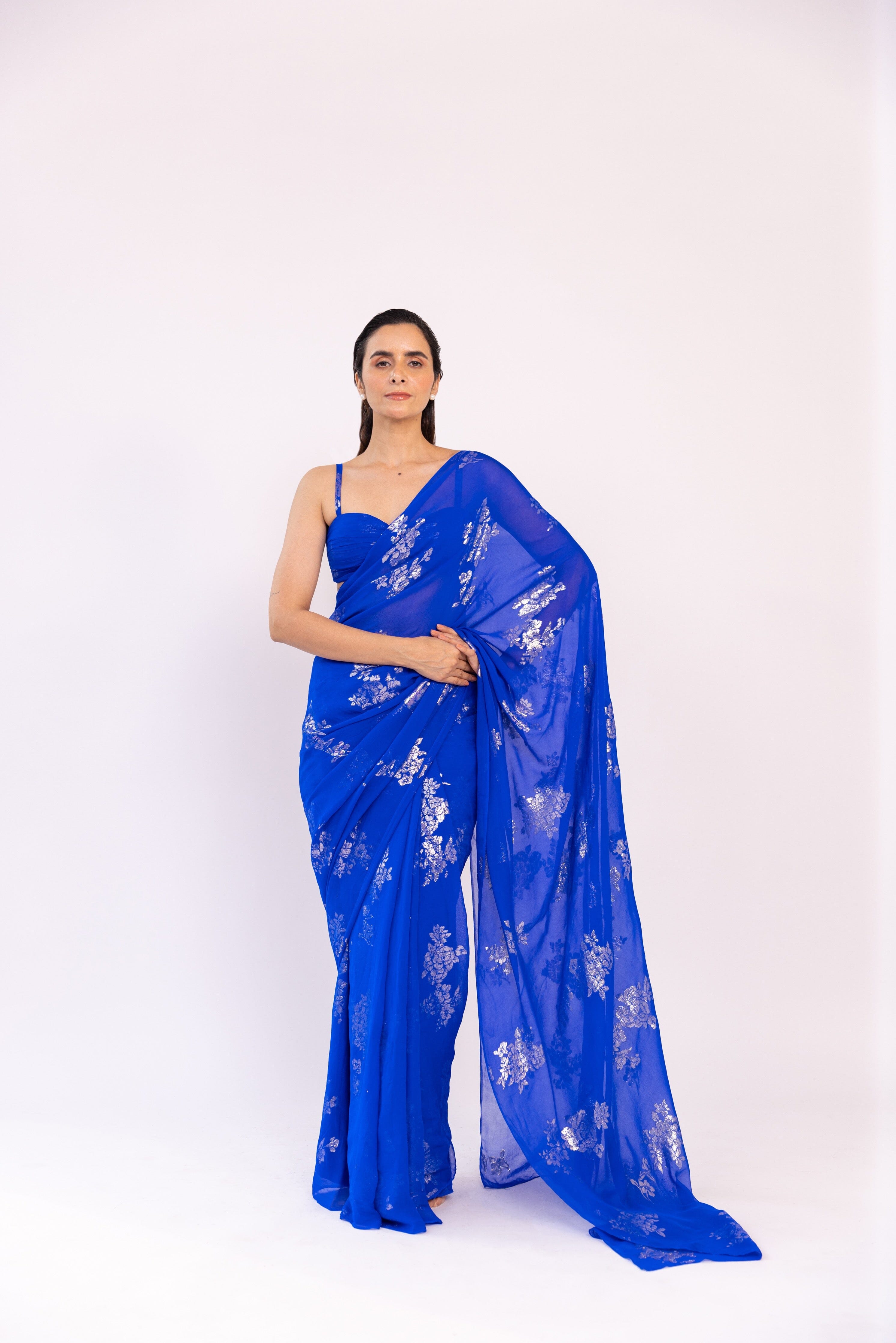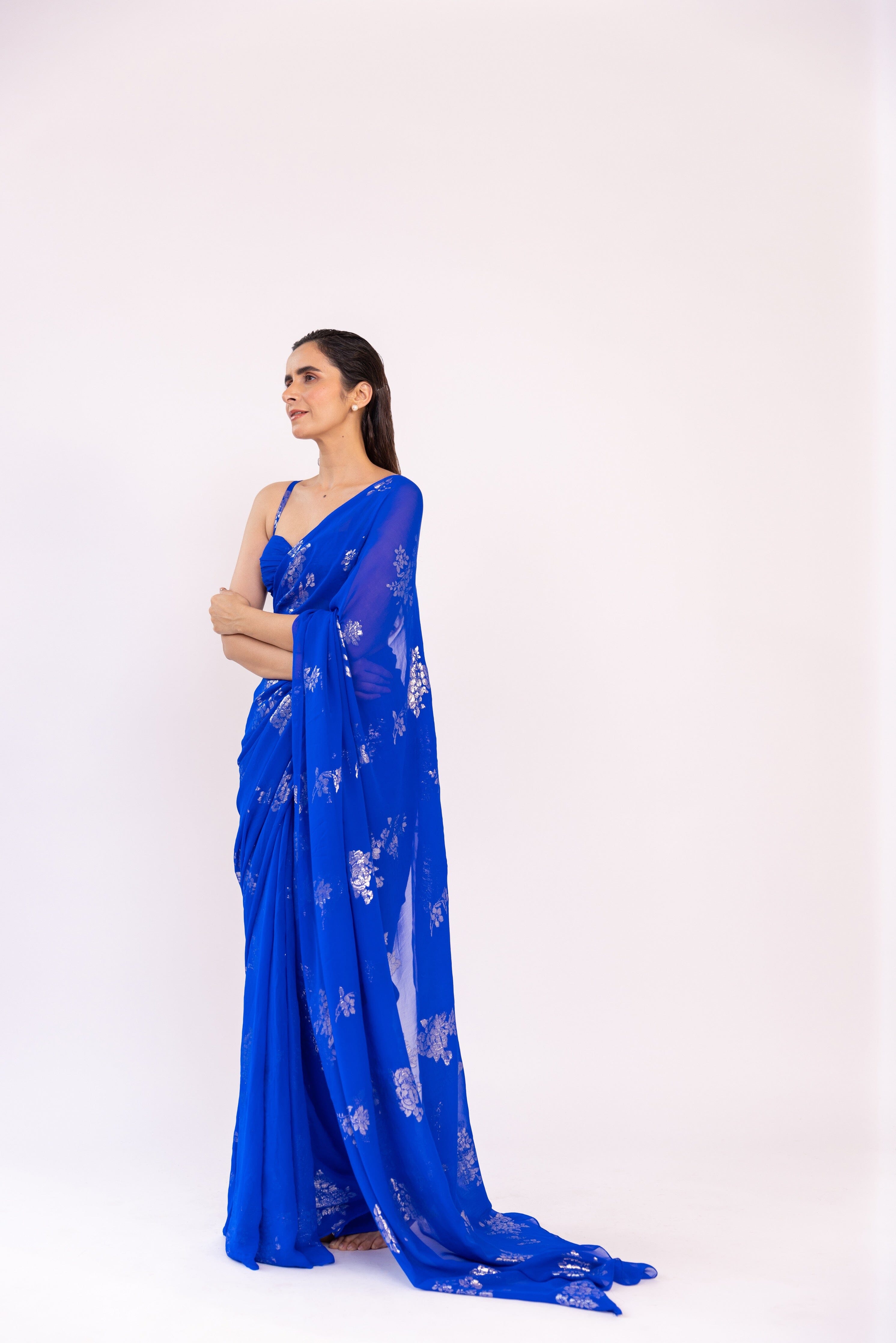 Featuring a royal blue pre-stitched saree in gorgette lurex base. It is paired with a strappy bandeau blouse.