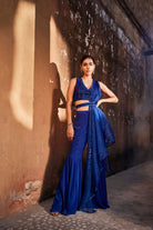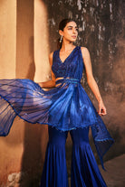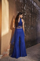 Blue embroidered choli with attached organza drape paired with sharara pants and an embroidered belt. This exquisite ensemble artfully combines traditional elements with modern design. The delicately embroidered choli is beautifully accented with an attached organza drape, effortlessly draping over the sharara pants and cinched at the waist with an embroidered belt. The result is a stunning and sophisticated look that exudes elegance and luxury. Elevate your wardrobe with this exclusive piece to make a statement at any event.