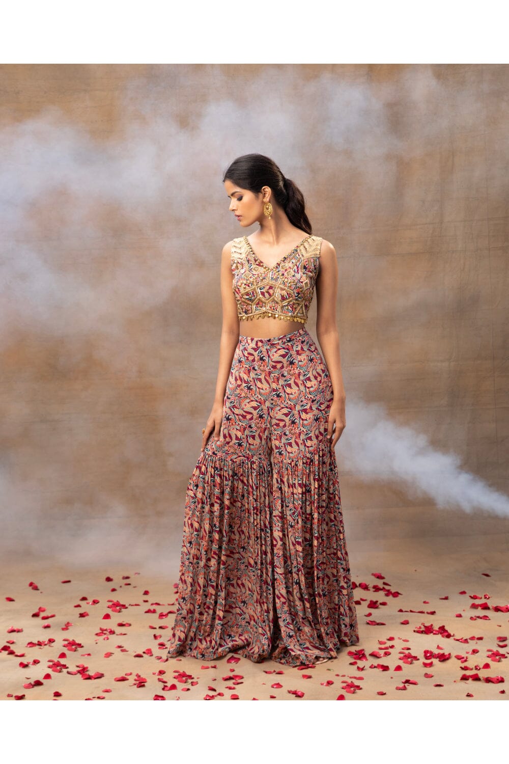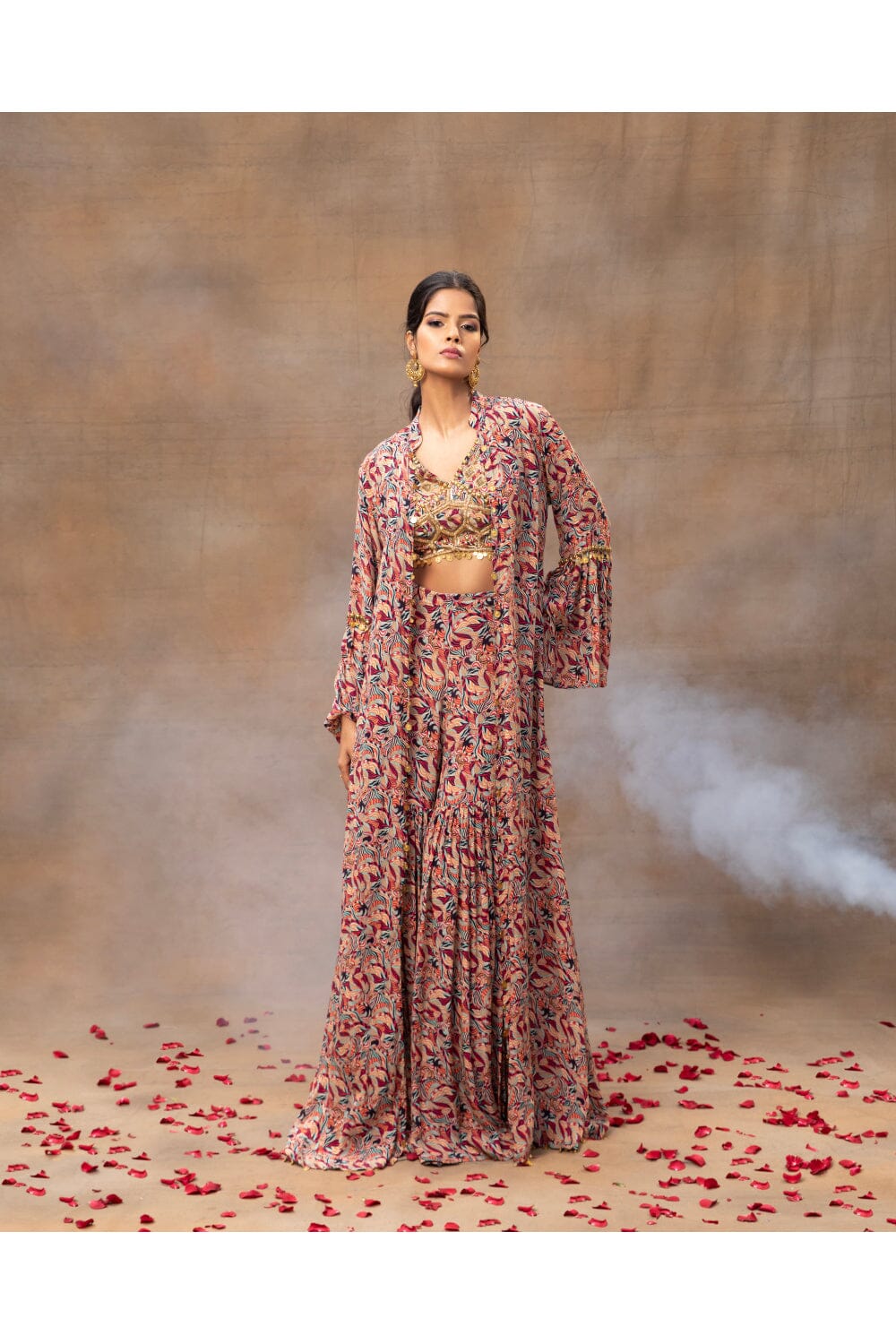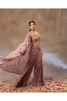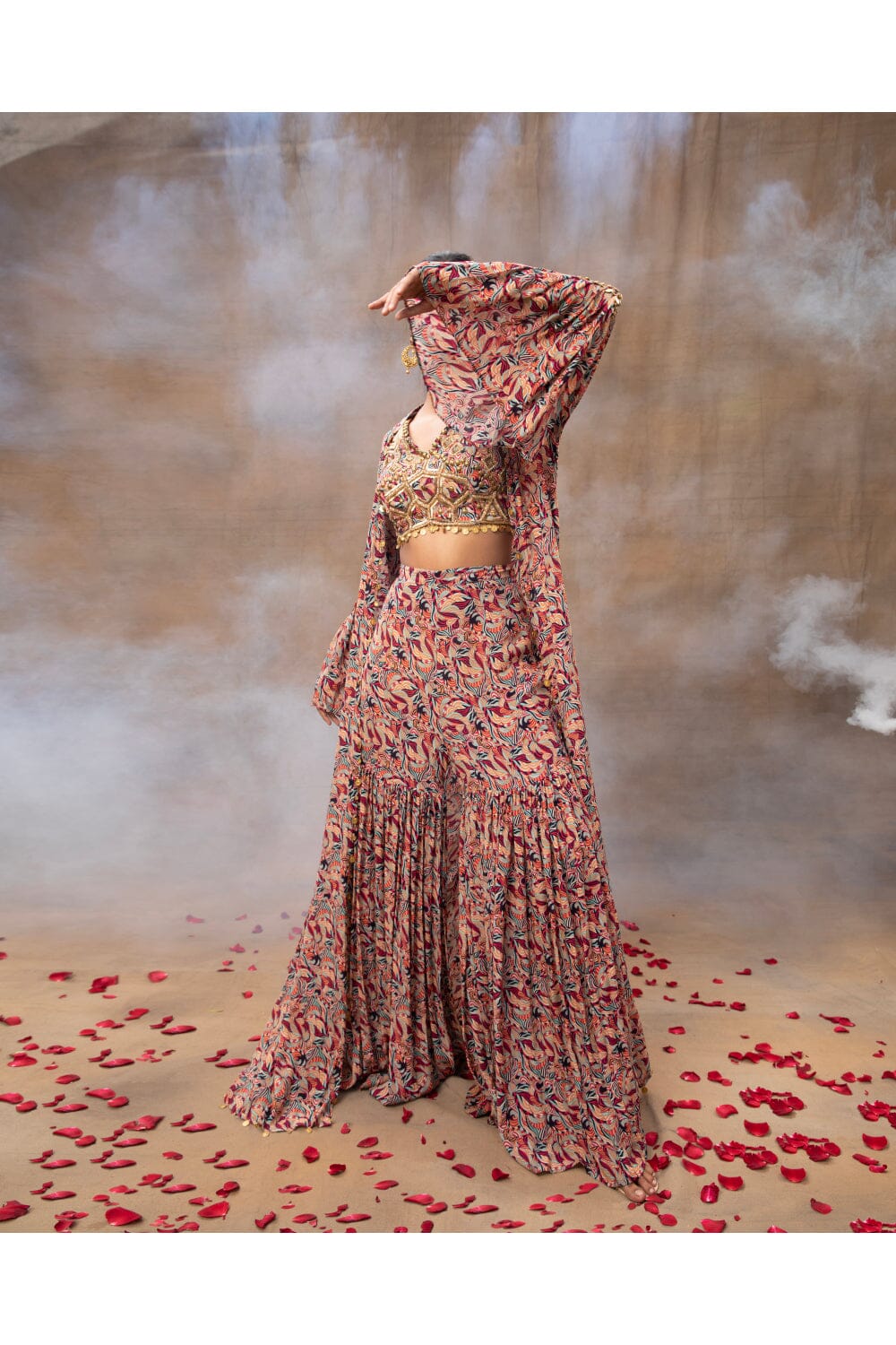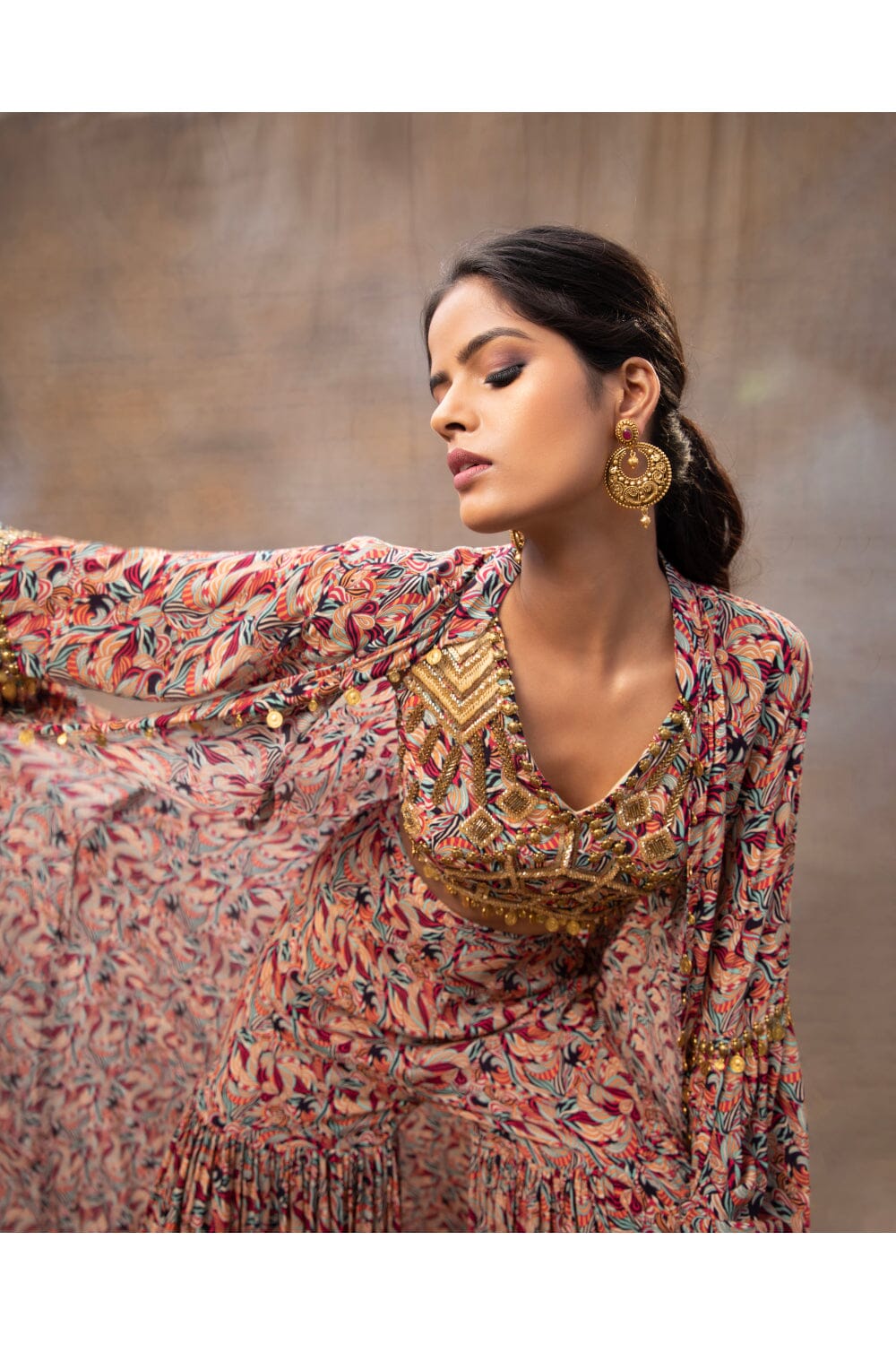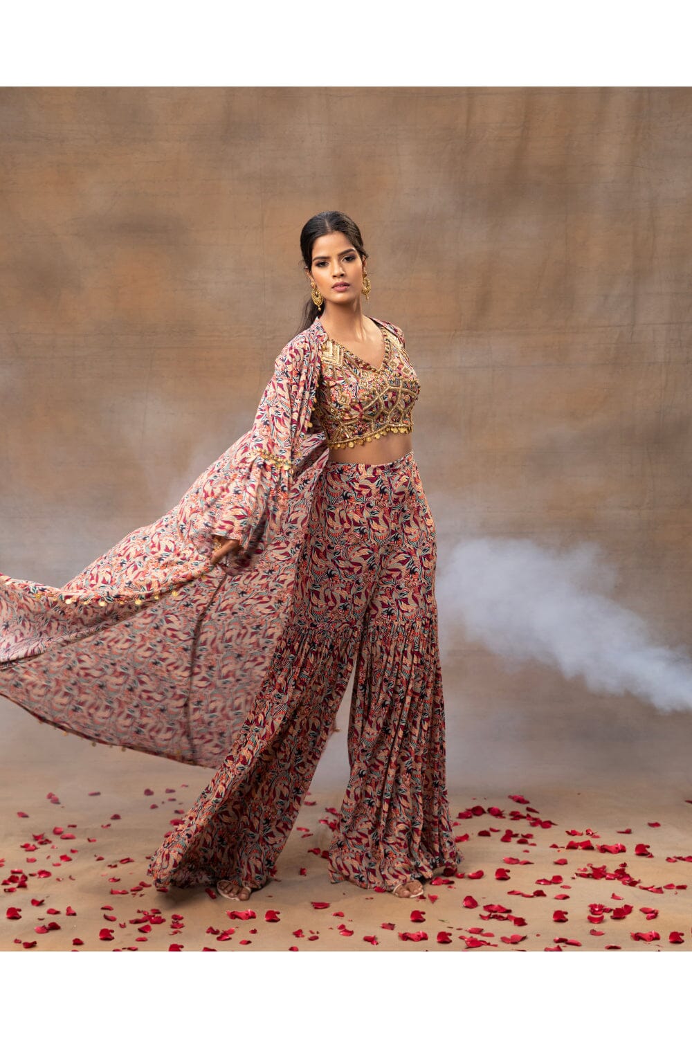 Introducing our exquisite Ivory Geometric Printed Choli Sharara and Cape Set, a masterpiece of elegance and style. The cape sleeves adorned with intricate pleats add a touch of sophistication, while the choli features delicate hangings for a graceful allure. With gathers accentuating the flowing sharara, and enchanting gold embroidery throughout, this ensemble exudes opulence and charm, perfect for any special occasion. Embrace the essence of timeless beauty and make a captivating statement with this stunning ensemble.