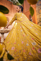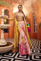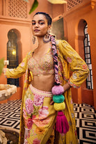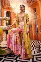 An elegant mustard-colored jacket featuring intricate applique embroidery, paired with a matching blouse adorned with applique work, and complemented by printed sharara pants.