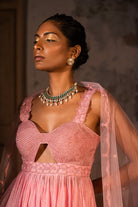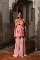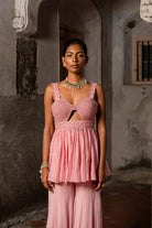 Baby Pink peplum set with thread work and hand-embroidery, paired with sharara. A thread work peplum set with sharara pants.