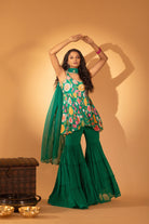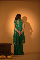 The outfit is a green sharara set featuring a peplum top with hand embroidery, paired with a hand embellished scallop dupatta. A embroidered sharara set with peplum and duptta