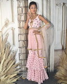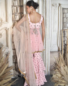 Enveloped between floral and geometric motifs lies this sharara set. The kurti is embellished with mirror work and gold kasab work. The net dupatta is embellished with an embroidered border. The plazzo is created with georgette making it comfortable, wearable and stylish. It is paired with an embroidered waist belt. We can customize the outfit colour and the blouse design for you.