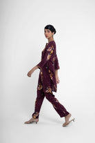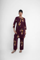 Maison Short Kurta Set In maroon is made on pure crepe fabric with a digitally illustrated print on it.