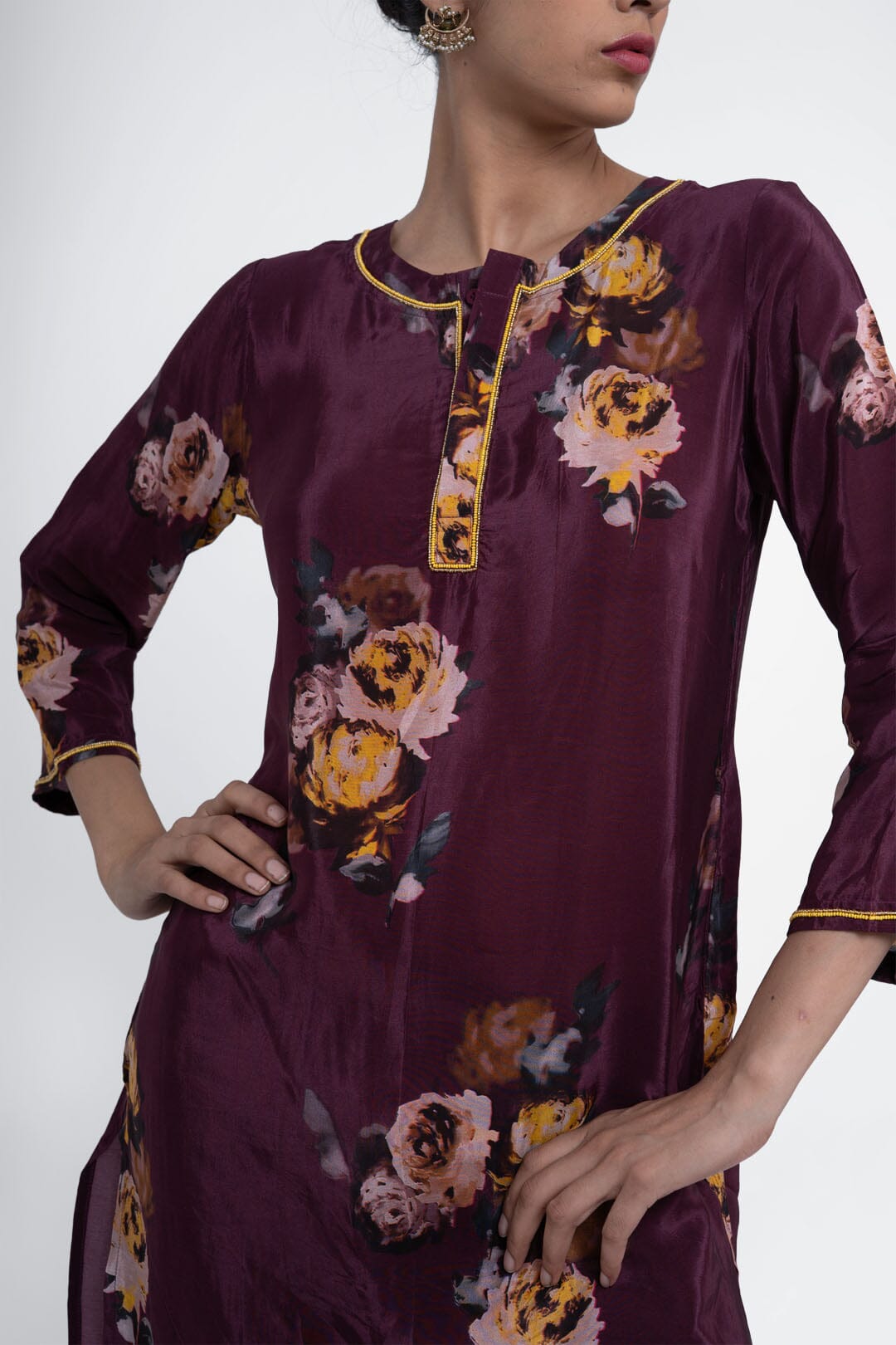 The kurta has a clean, round neckline with a kurta placket which is highlighted with detailed hand embroidery.