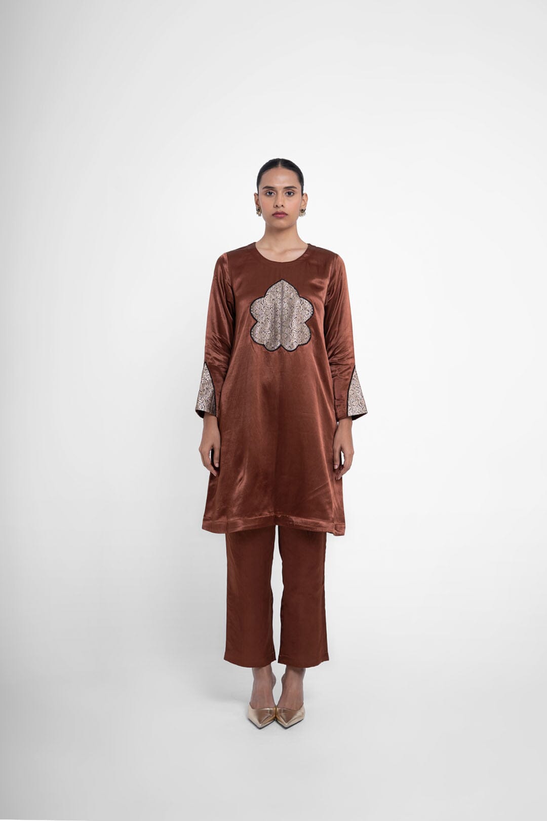 Maria kurta set in brown has a A Line fit kurta with a round neck which has pockets on each side, paired with relaxed fit pyjamas, which is elasticated at the waist for added comfort. The set has a black banarasi brocade patch on the kurta and sleeves to give it a modern twist.