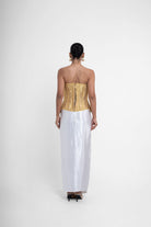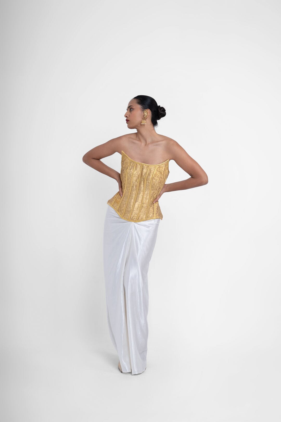 Novaro, A striking ensemble featuring a structured golden lampi corset with a contoured, strapless neckline and vertical panel detailing for a sculpted fit.