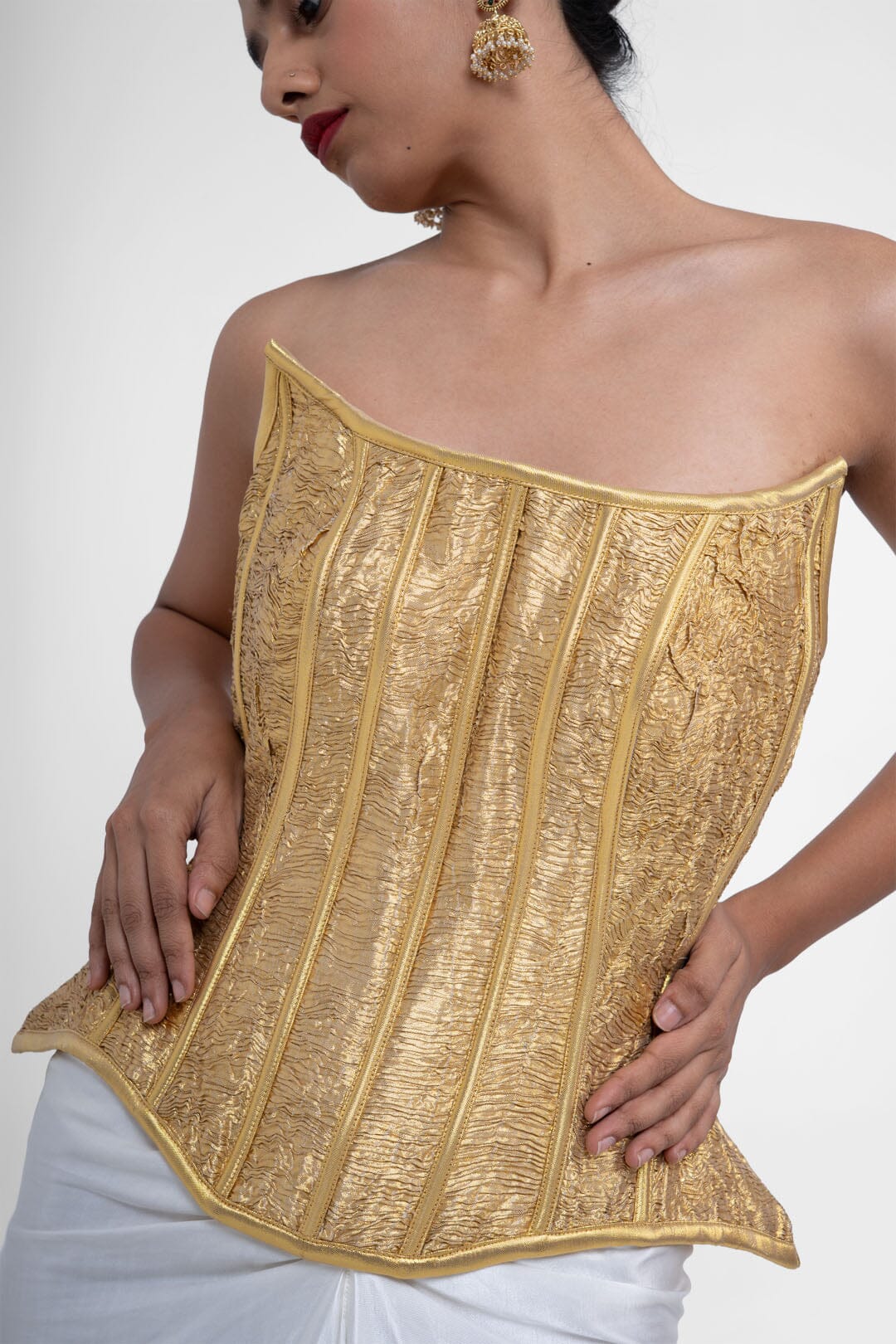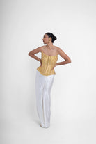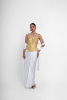 Novaro, A striking ensemble featuring a structured golden lampi corset with a contoured, strapless neckline and vertical panel detailing for a sculpted fit. Paired with a fluid satin drape skirt that falls elegantly to the ankles, the look is completed with a matching satin stole adorned with delicate pearl hanging tassels, adding movement and refined luxury.