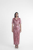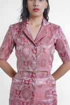 Scarlet silk coord set features a crop blazer with shoulder pads and elbow sleeve length paired with scarlet pencil skirt which has thigh slit, pockets on the sides and a center zip closing. The set is made in Mauve Varanasi silk, drawn from our archives.