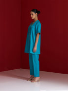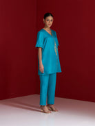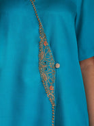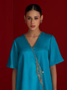 A vibrant blend of tradition and finesse, this cerulean blue kurta set features a contemporary Angrakha-style silhouette. The kurta is delicately hand-embroidered along the wrap panel using fine naqshi, sequins, and resham thread, creating a subtle shimmer with every movement. Even the handcrafted button detail adds to its artisanal charm. Paired with matching straight pants, this ensemble strikes the perfect balance between elegance and ease. CERULEAN BLUE EMBROIDERED KURTA WITH PANTS