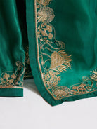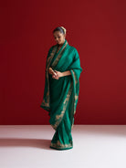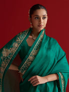 Gracemeets grandeur in this striking emerald green saree, meticulously hand-embroidered along the borders with dabka, naqshi, gold zari, and silk resham. The embroidery features powerful Yali motifs-mythical guardian creatures symbolizing strength and protection, flowing gracefully along the border, making a bold statement through the traditional drape. Paired with a solid emerald blouse featuring a chic square neckline, this saree blends timeless artistry with meaningful storytelling. Saree is crafted in hand woven gajji silk and the pallu is in silk organza.EMERALD GREEN EMBROIDERED SAREE WITH BLOUSE