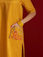 This vibrant mustard kurta set in rich Gajji silk is a celebration of bold heritage and everyday comfort. The straight-cut kurta features two functional pockets, brought to life with exquisite hand embroidery. Intricately crafted using dabka, naqshi, and striking pink resham thread, the pockets showcase powerful Yali tiger motifs-symbols of strength and grace. Paired with coordinating straight pants, this versatile ensemble blends tradition with a playful modern twist. MUSTARD EMBROIDERED KURTA WITH PANTS