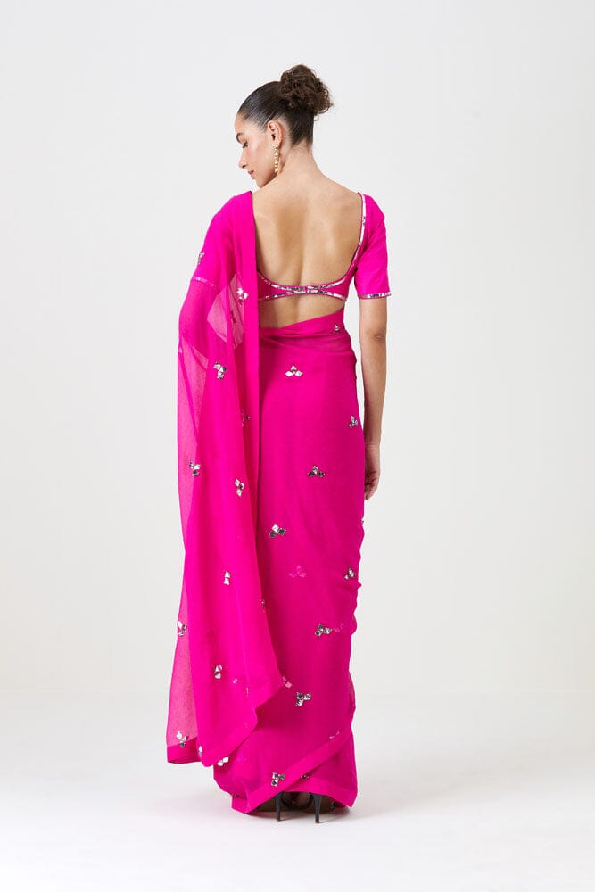 This saree set in crinkle chiffon is perfect for any festival or gathering. The neckline of the blouse screams pure royalty. The Mukaish work contrasts the striking boldness of the neon pink with a touch of innocent sparkle, creating a perfect balance of simple, chic and festive.