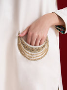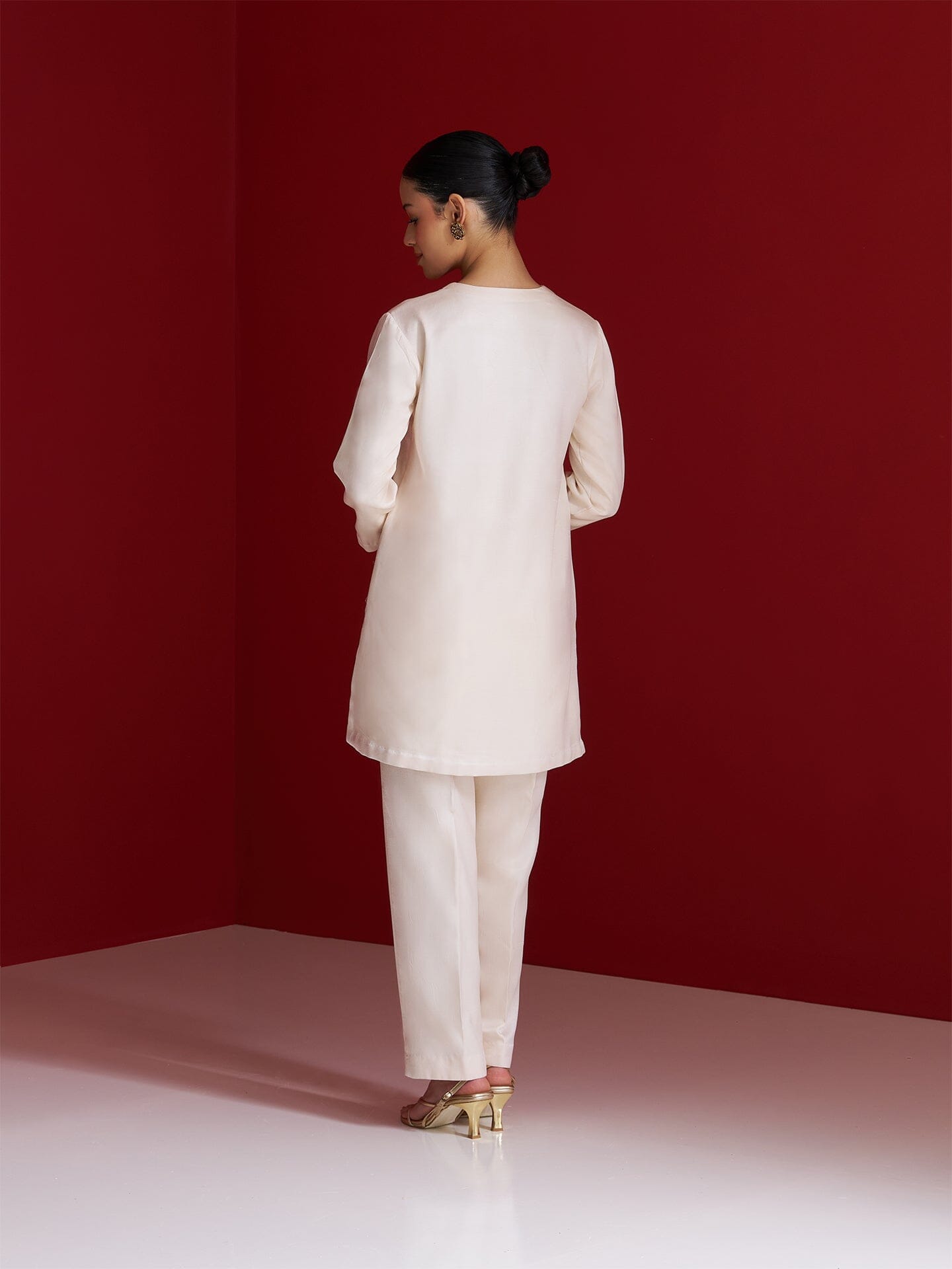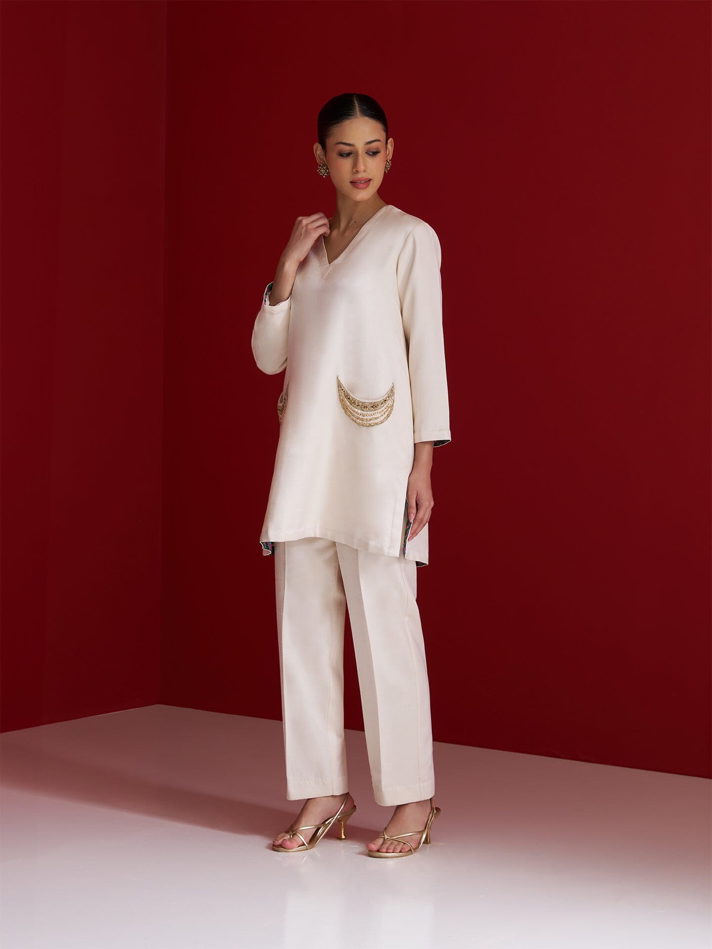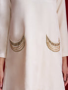 Crafted in lustrous Gajji silk, this ivory kurta set exudes understated elegance with a touch of intricate artistry. The kurta features unique chaand-shaped pockets, delicately embellished with zari and hand-embroidered using dabka, naqshi, and sequins in fine floral motifs. The subtle V-neckline and clean silhouette is paired with straight pants in a matching hue. IVORY CHAAND POCKET KURTA WITH PANTS