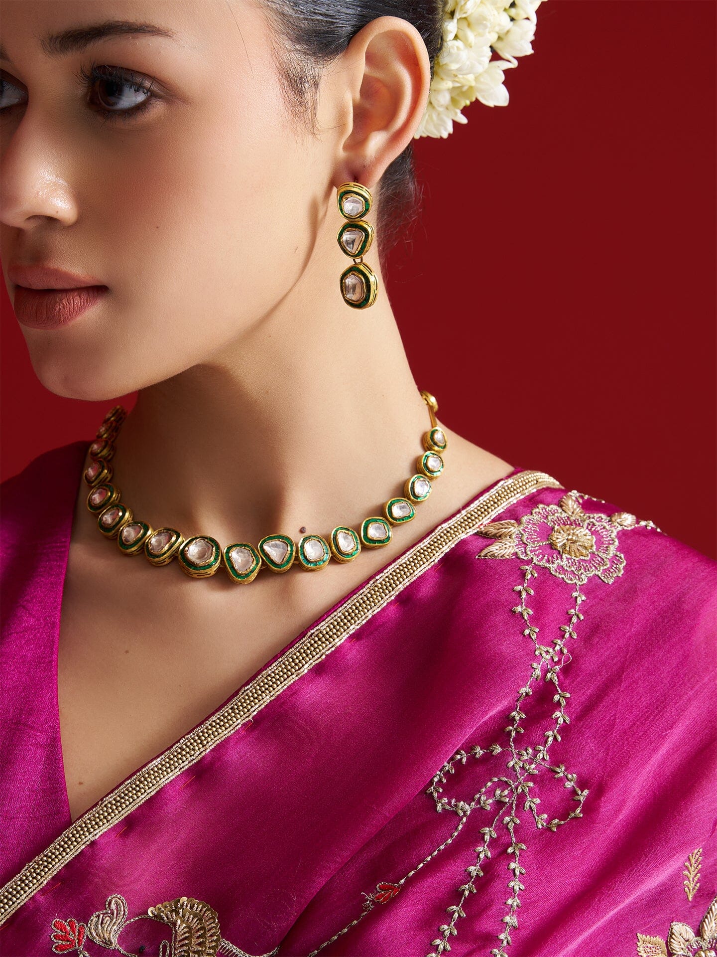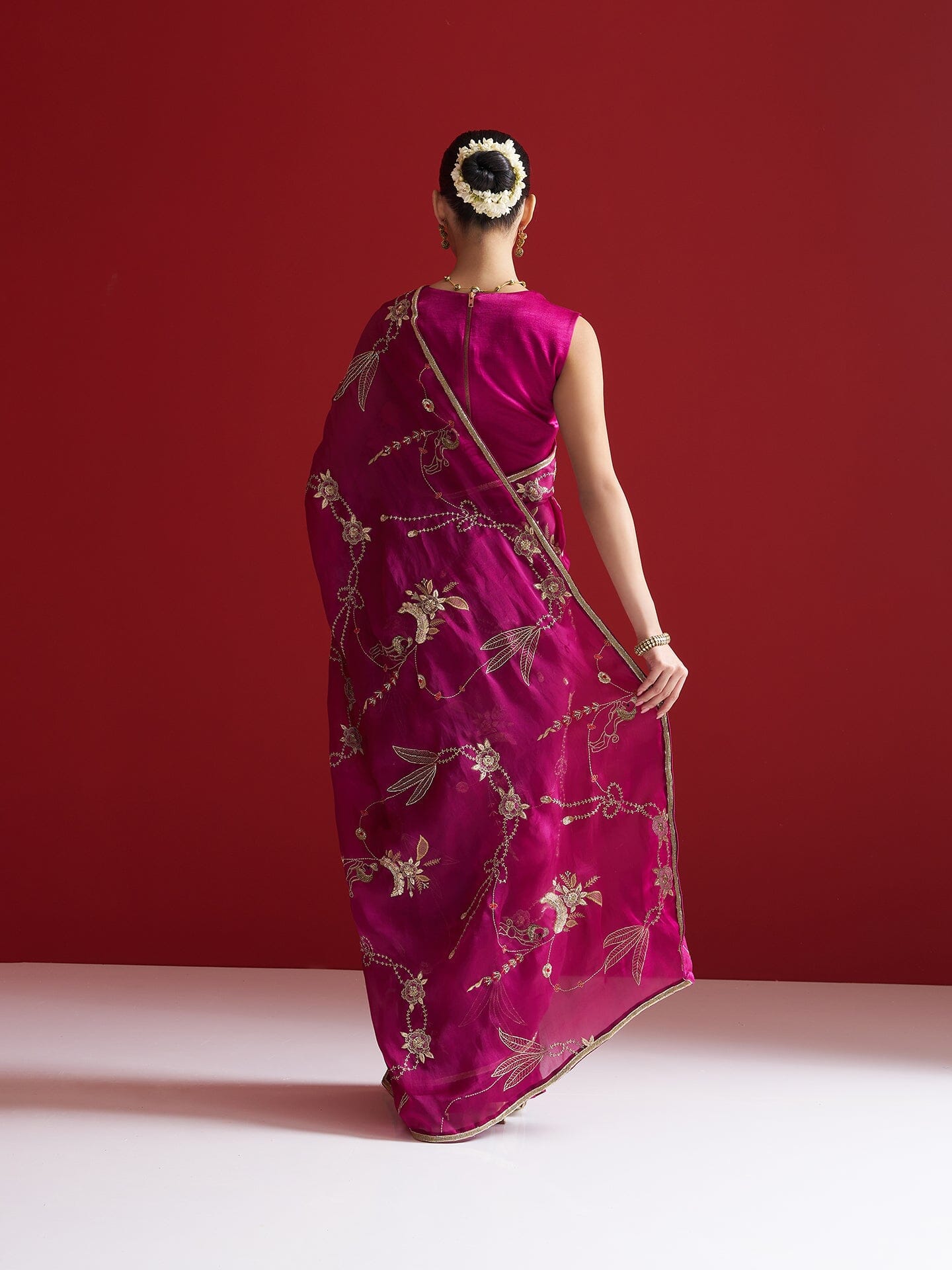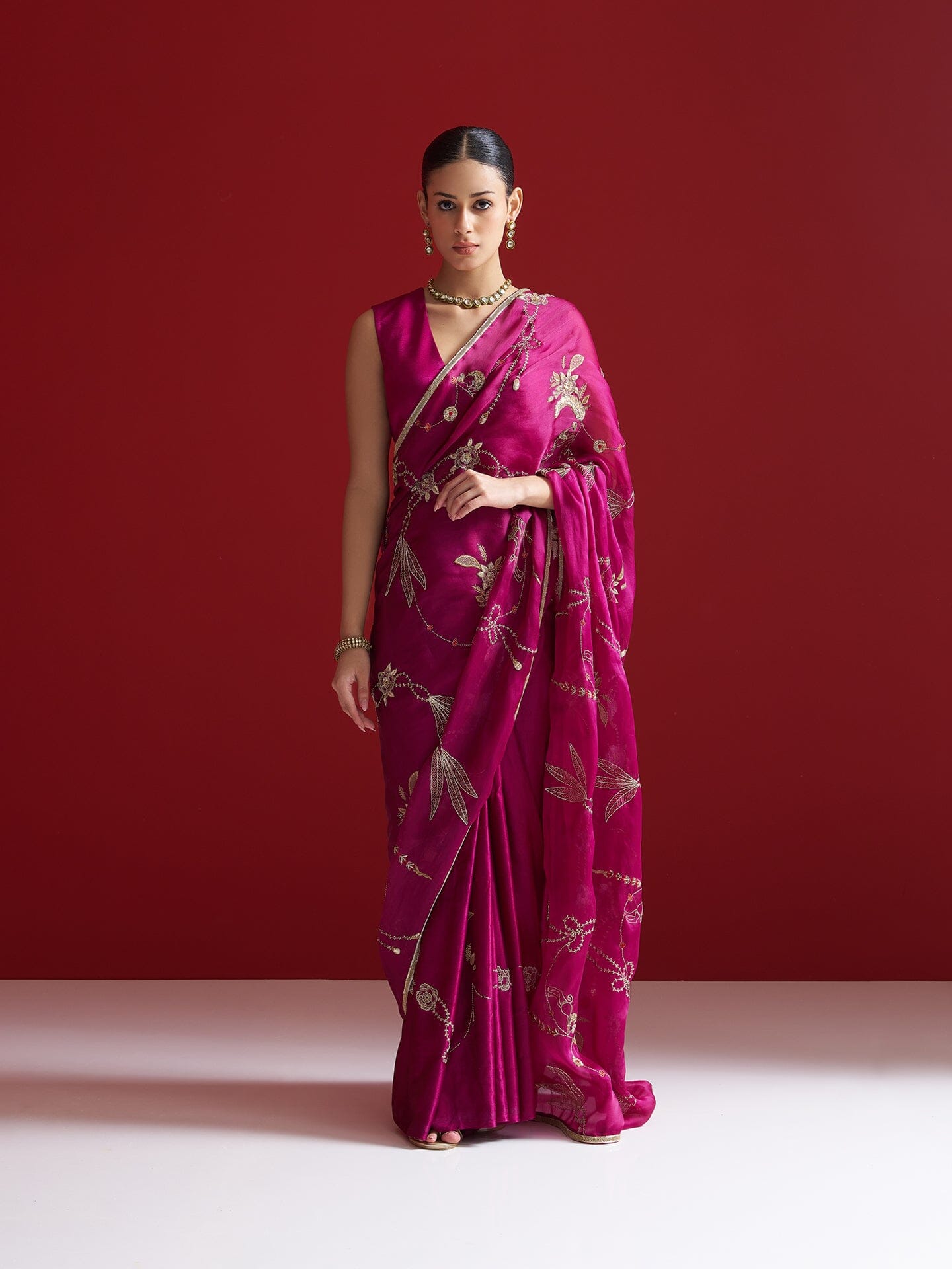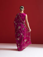 Crafted in luxurious handwoven Gajji silk and Silk Organza, this fully embroidered saree is a celebration of fine craftsmanship and heritage. Adorned with intricate floral patterns and majestic Yali motifs-powerful mythical guardians symbolizing strength and courage, the embroidery is brought to life using dabka, naqshi, and resham. A flowing silk organza pallu adds lightness and movement, creating a striking contrast. It is paired with a solid blouse featuring a deep V-neck and metal zipper closure at the back. MULBERRY WOOD PURPLE EMBROIDERED SAREE WITH BLOUSE