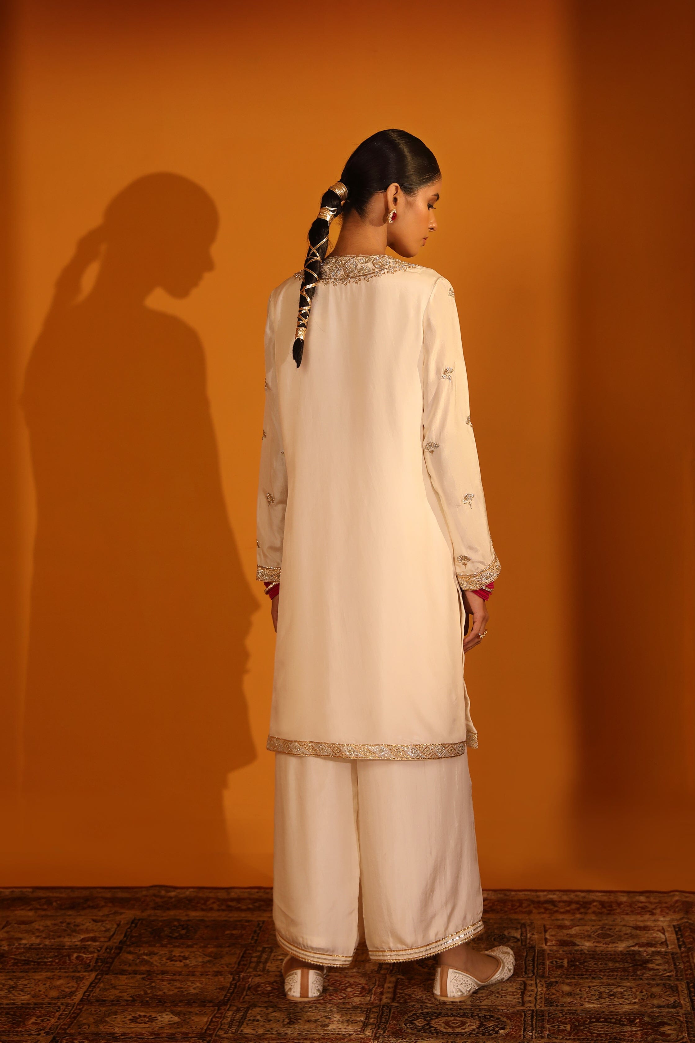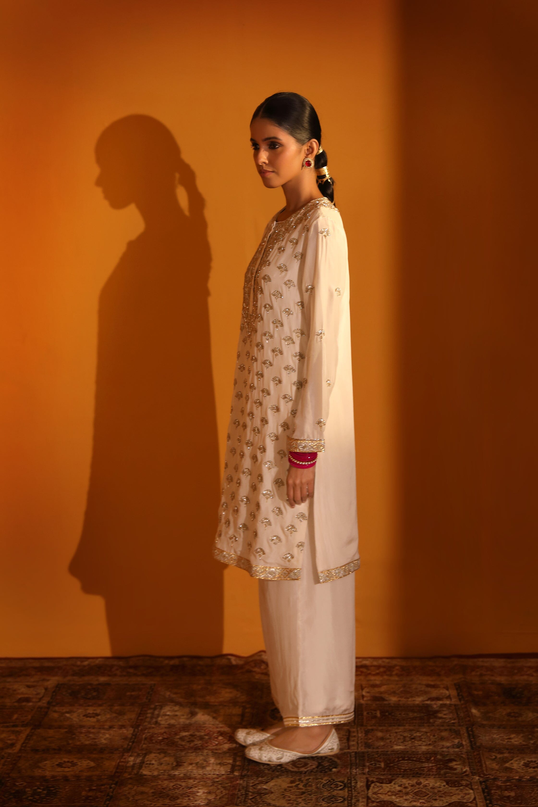 This kurta set is a graceful embodiment of elegance, with a delicate ivory tone that exudes charm. It features intricate naqshi, zardozi, and gota embroidery, accented with hand-stitched sequins. The loose-fitting bottoms paired with the kurta create an enigmatic aura, further enhanced by the ivory- hued organza dupatta.