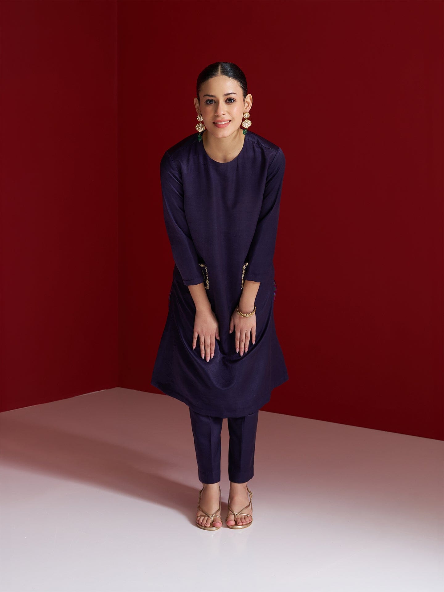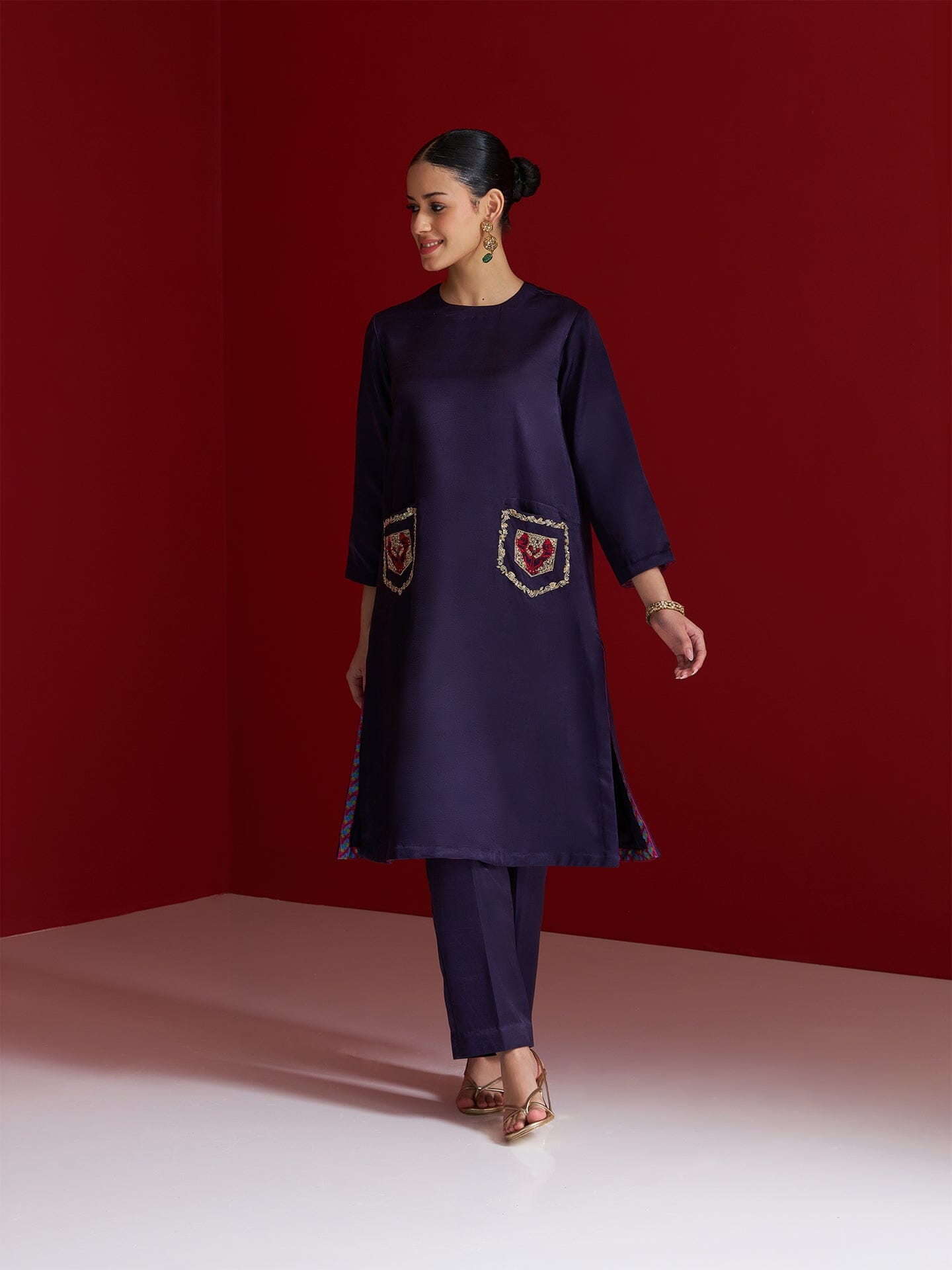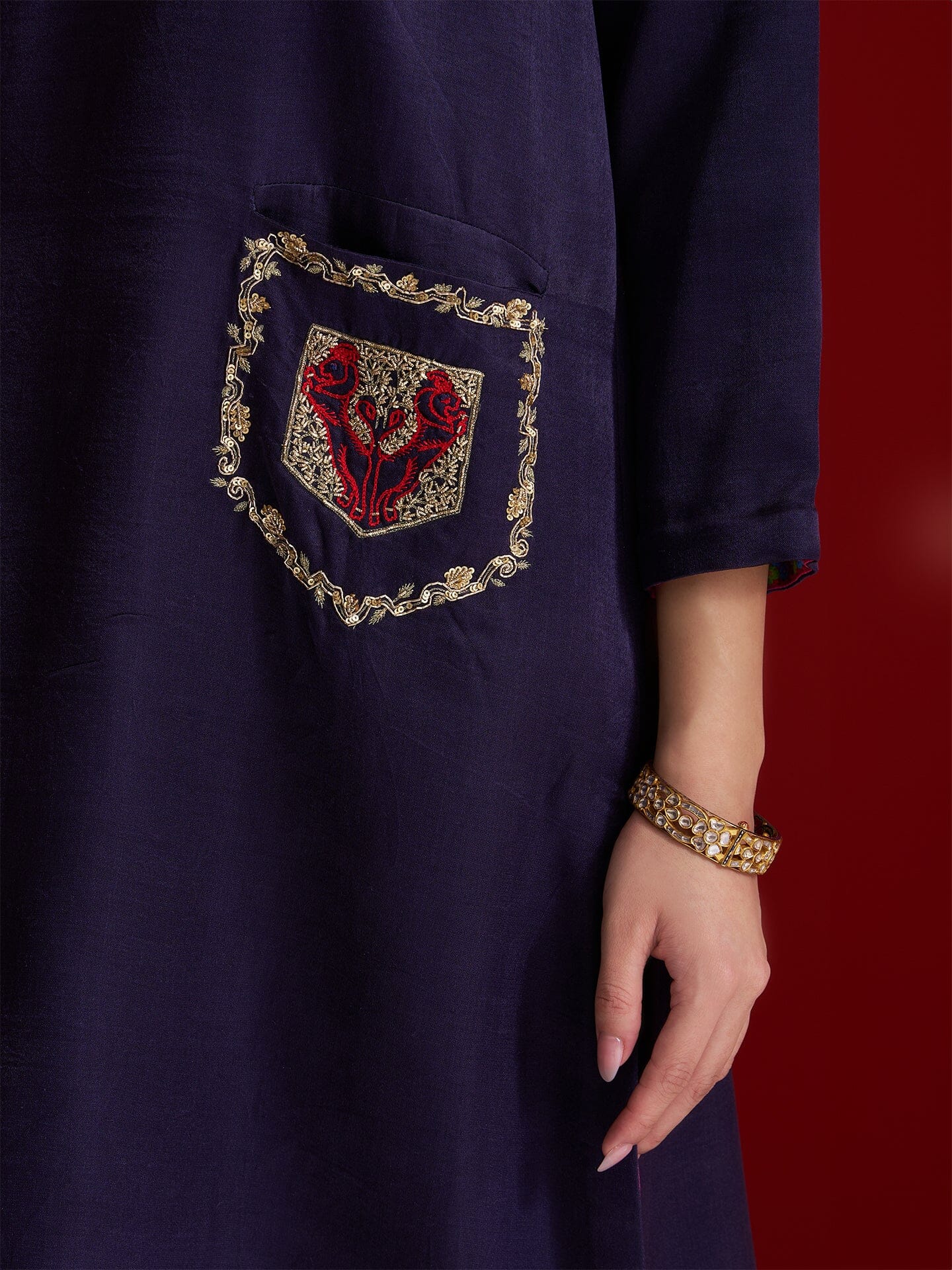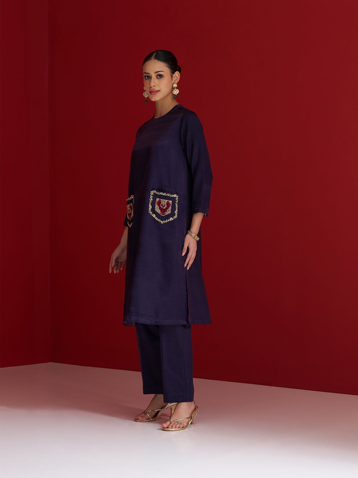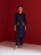 Step into understated elegance with this midnight blue kurta set, crafted in lustrous Gajji silk. The straight-cut kurta features statement pockets hand-embroidered with intricate Yali tiger motifs-crafted using shimmering sequins, naqshi, and rich resham threads. A powerful symbol of courage and heritage, the Yali brings a bold narrative to this minimalist silhouette. Paired with matching straight pants, this ensemble is a perfect fusion of tradition and contemporary charm. MIDNIGHT BLUE POCKET EMBROIDERED KURTA WITH PANTS