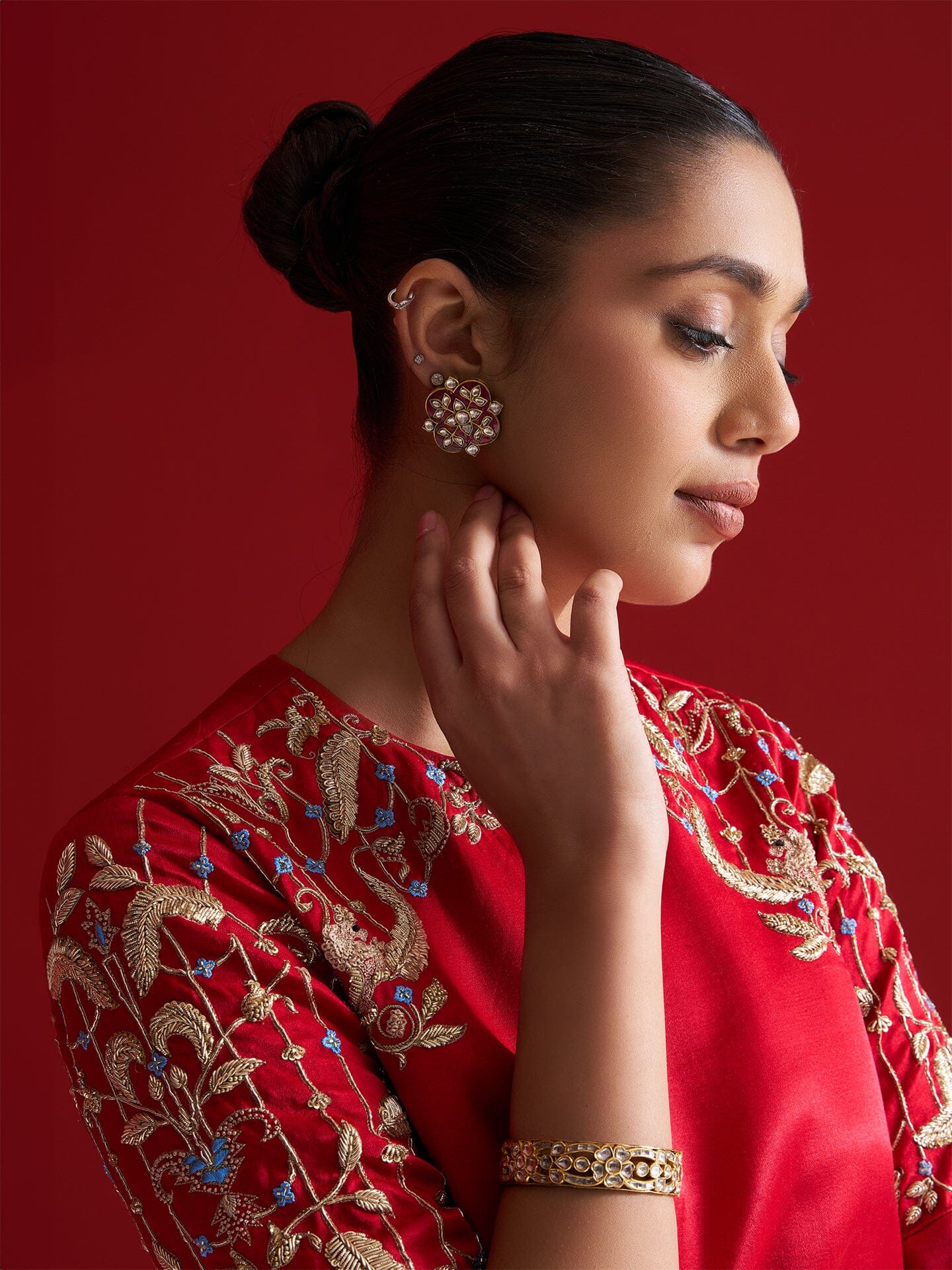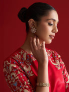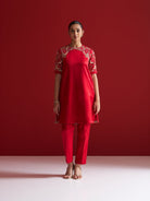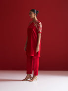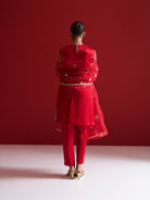 Fierce yet graceful, this vibrant red kurta set is a celebration of heritage and power. The kurta is adorned with intricate hand embroidery featuring majestic Yali tigers-mythical creatures symbolising strength and protection. Detailed with traditional dabka, naqshi, beads, and contrasting blue resham thread, the embroidery brings the motifs to life with stunning dimension. It is paired with matching straight pants. RED EMBROIDERED KURTA WITH PANTS