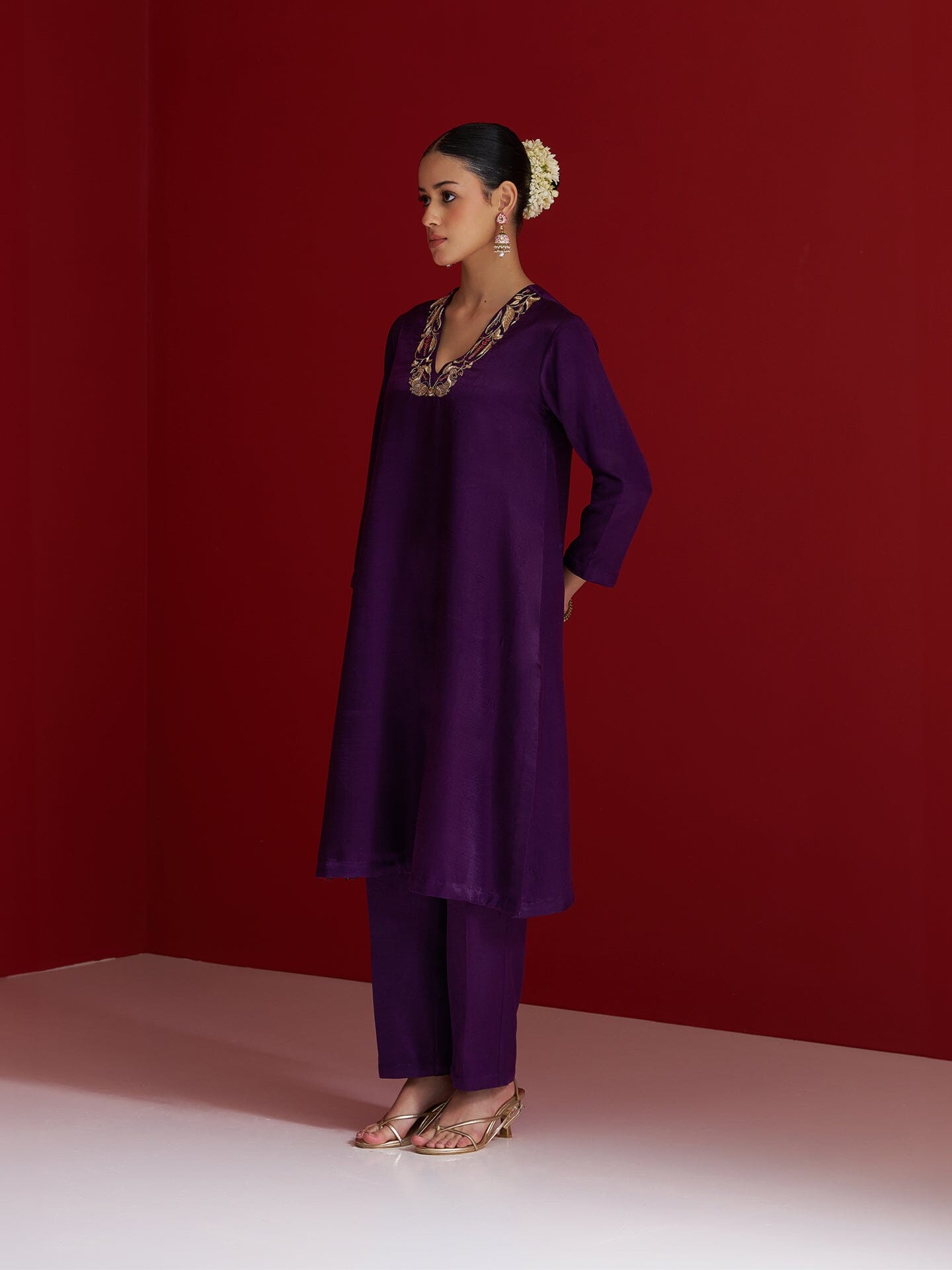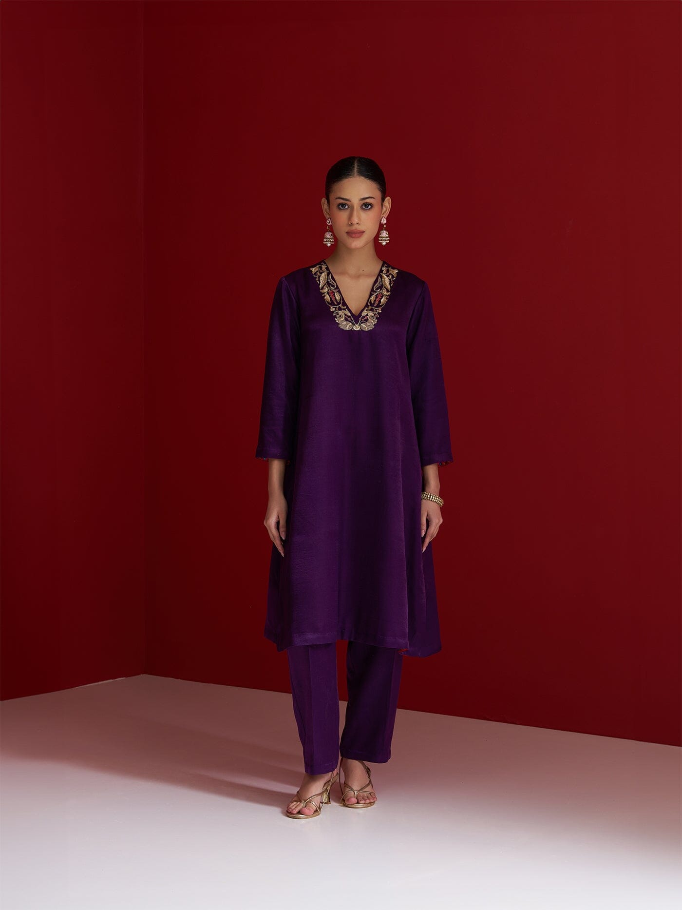 This royal purple kurta set is crafted in luxurious gajji silk and features a delicately contoured V-shaped neckline. The neckline is adorned with exquisite hand embroidery using traditional techniques-dabka, naqshi, resham, and zari, meticulously brought to life in ornate leaf and vine patterns.