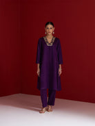 The embroidery proudly highlights two majestic Yali motifs-mythical tiger-like creatures symbolic of power and protection in Indian folklore. Paired with matching straight pants for a clean, contemporary silhouette, this set is a perfect balance of tradition and modern sophistication. ROYAL PURPLE EMBROIDERED KURTA WITH PANTS