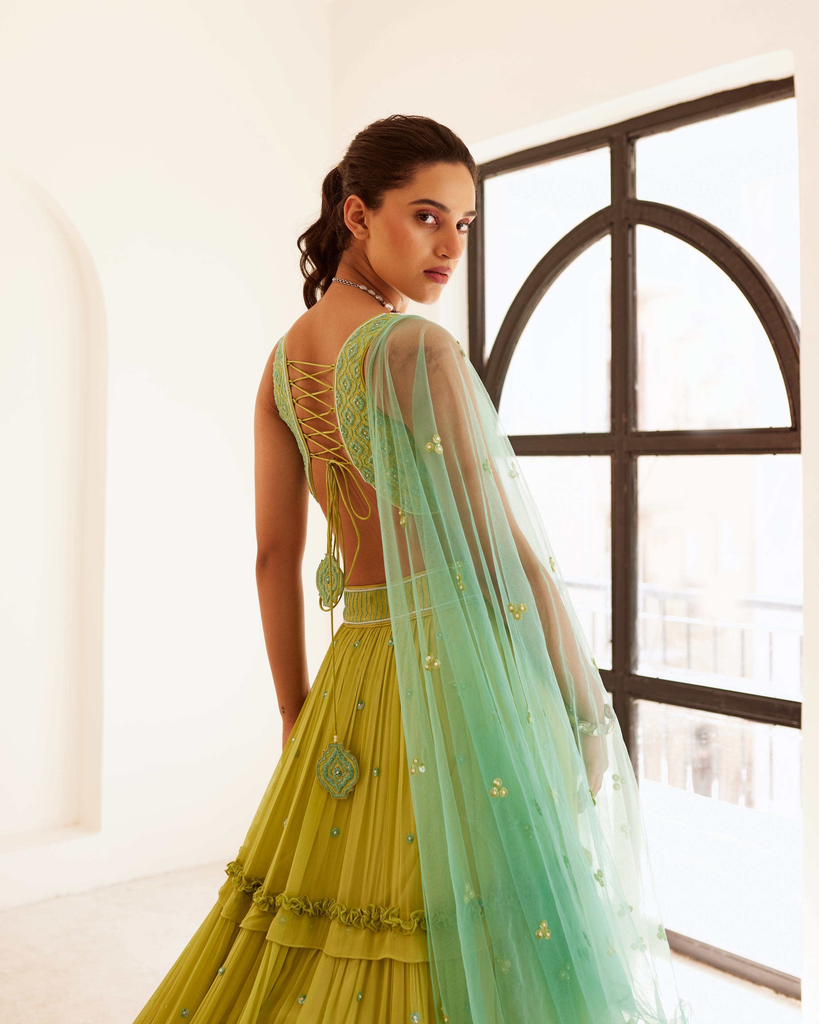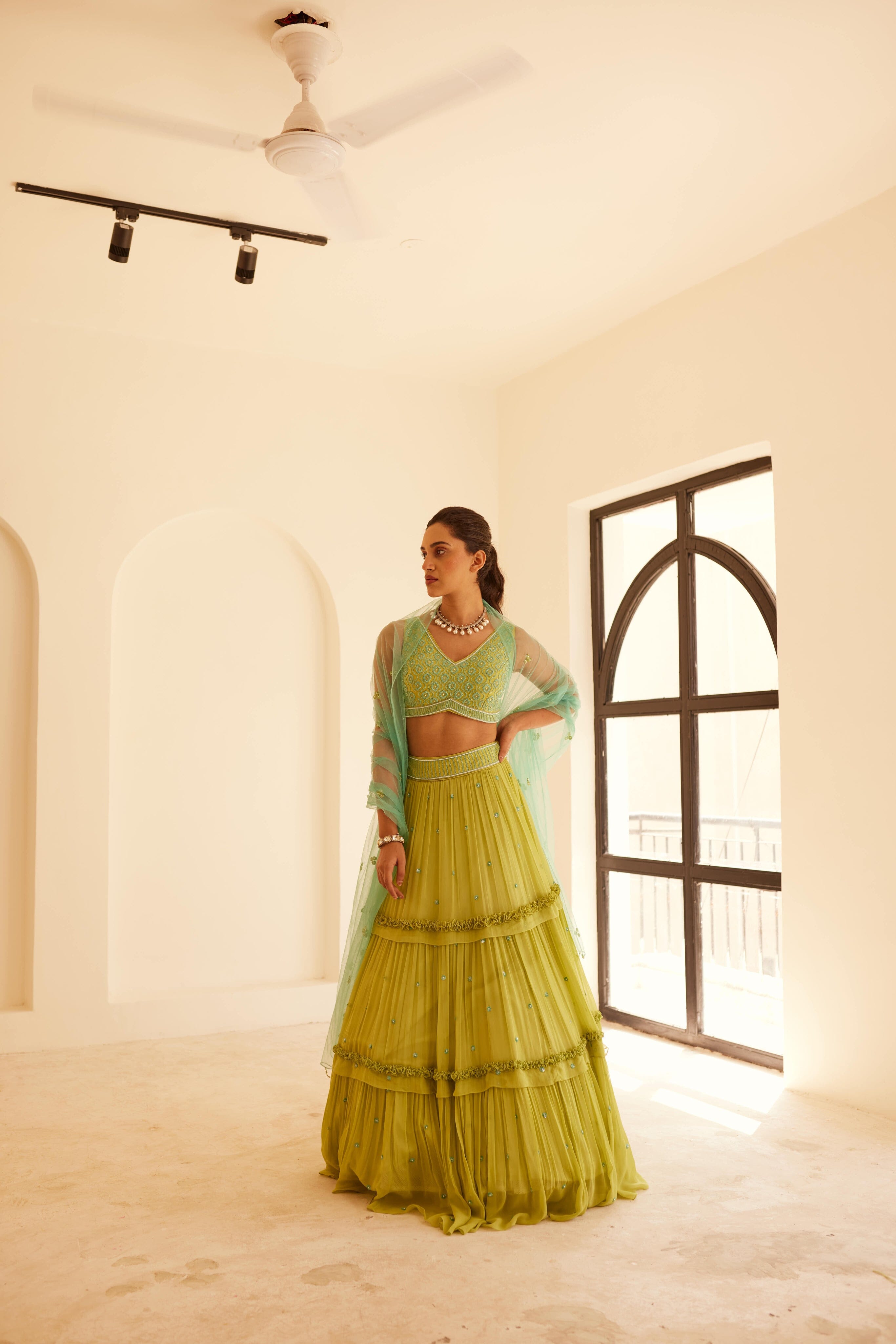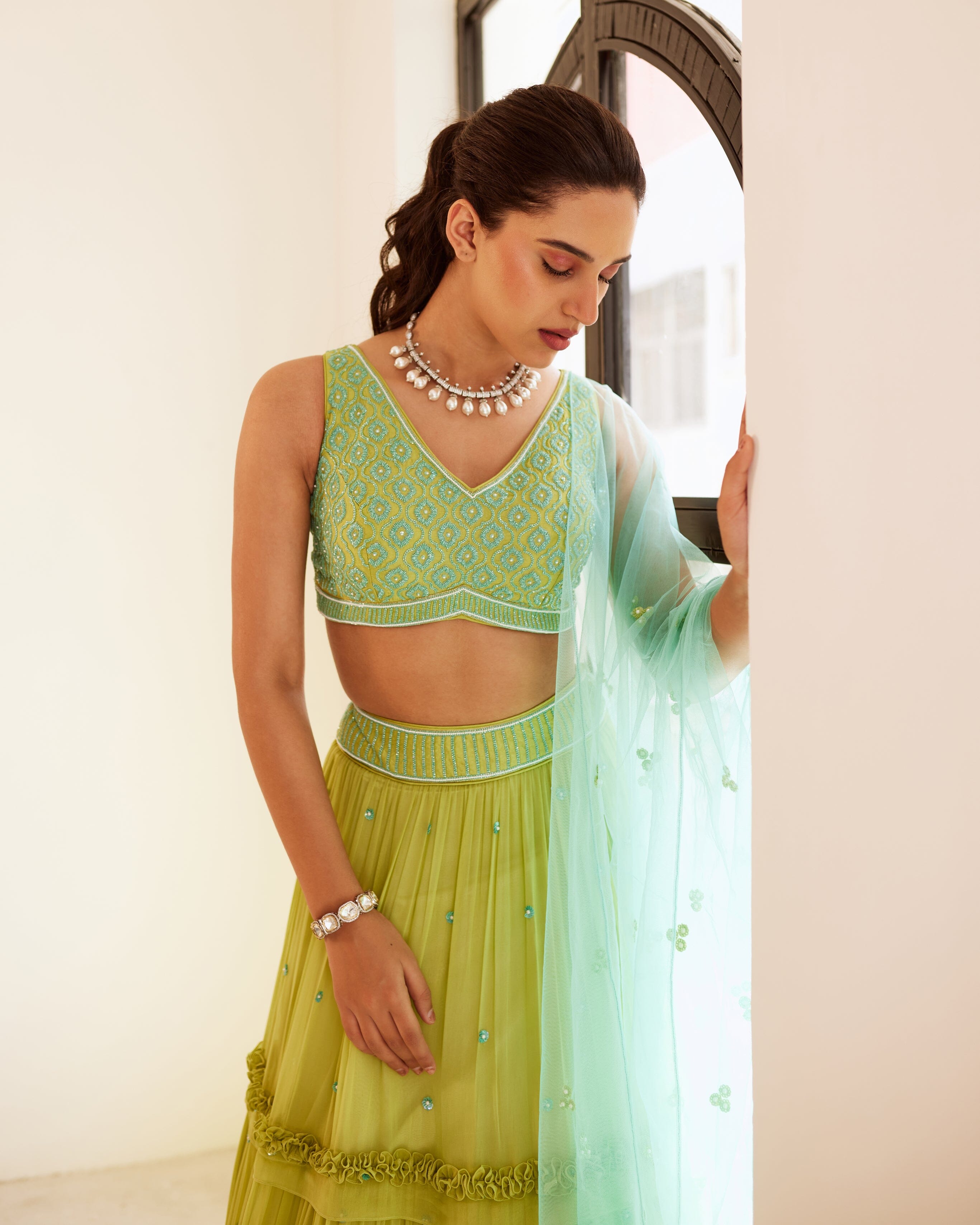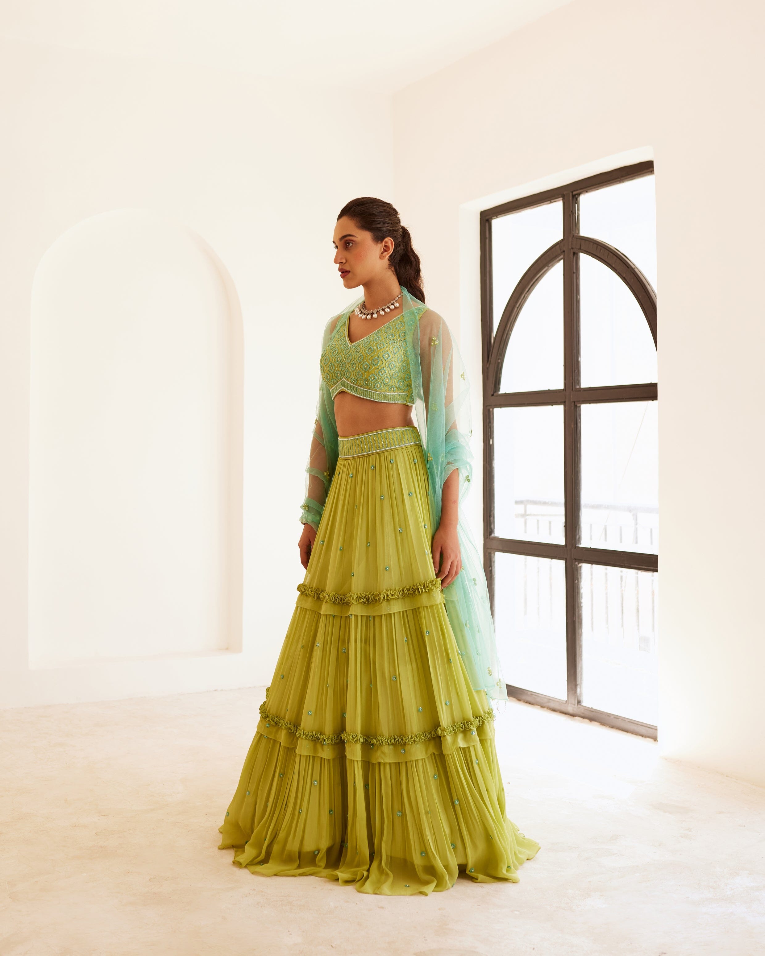 Green embroidererd choli with layered lehenga and blue net dupatta.