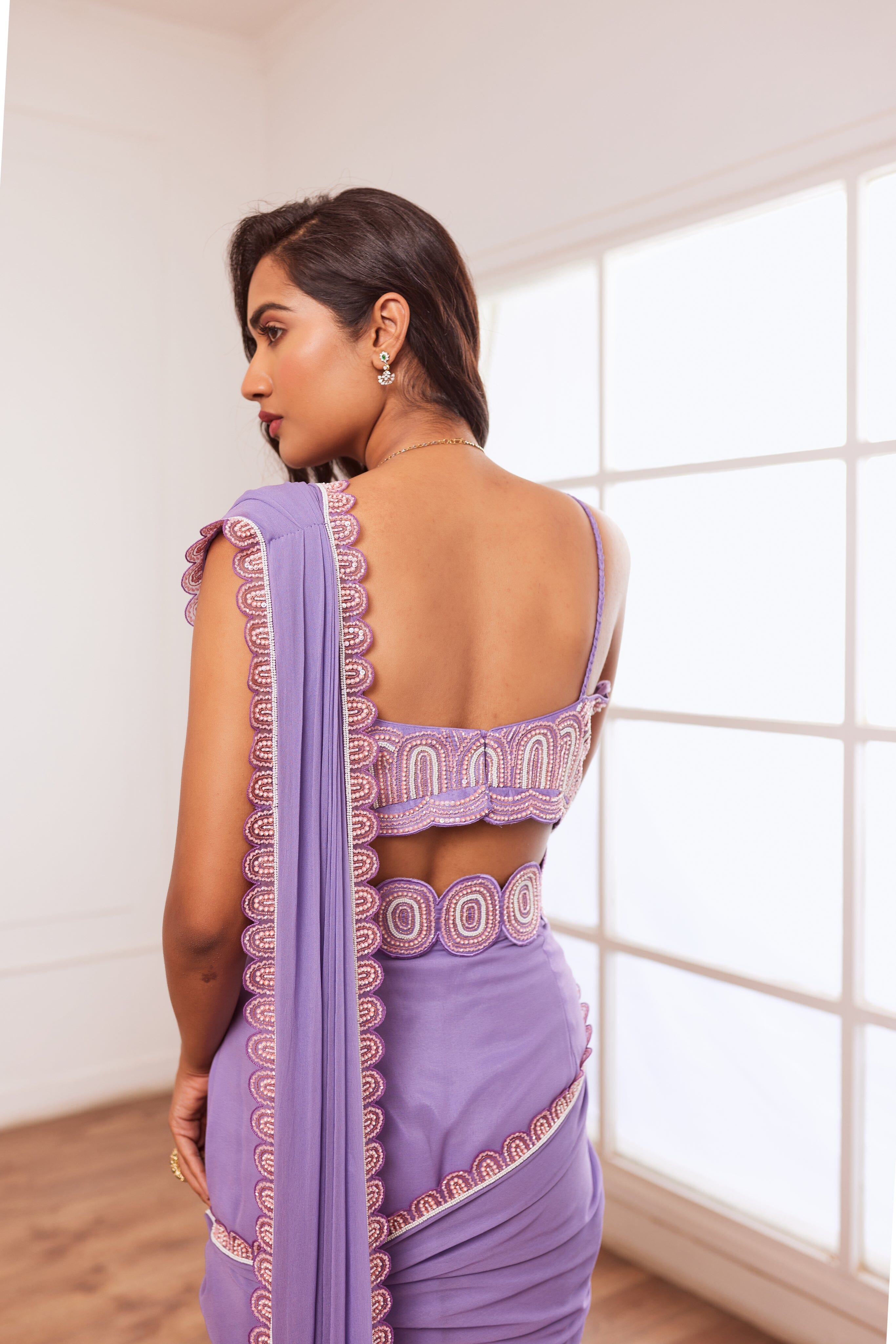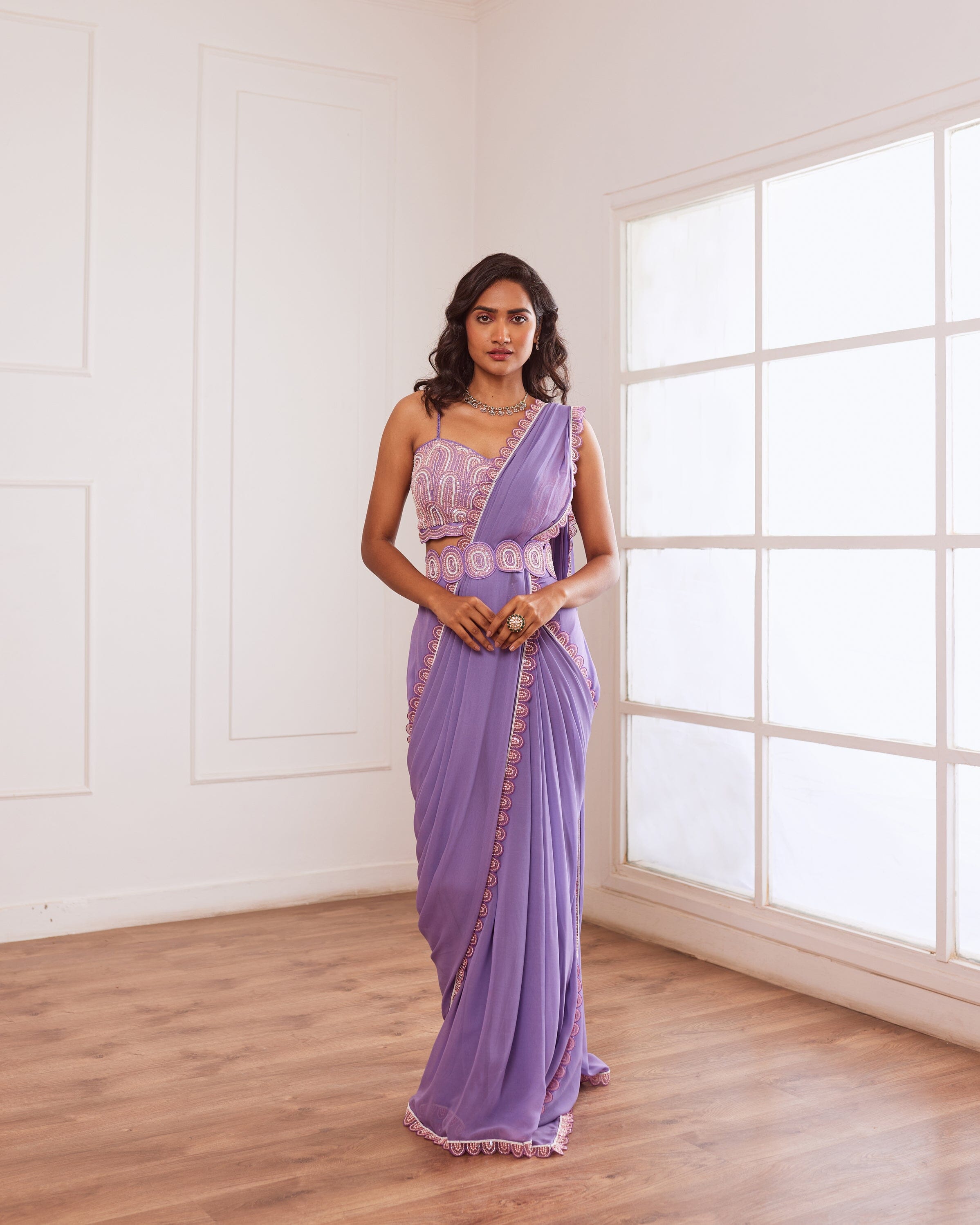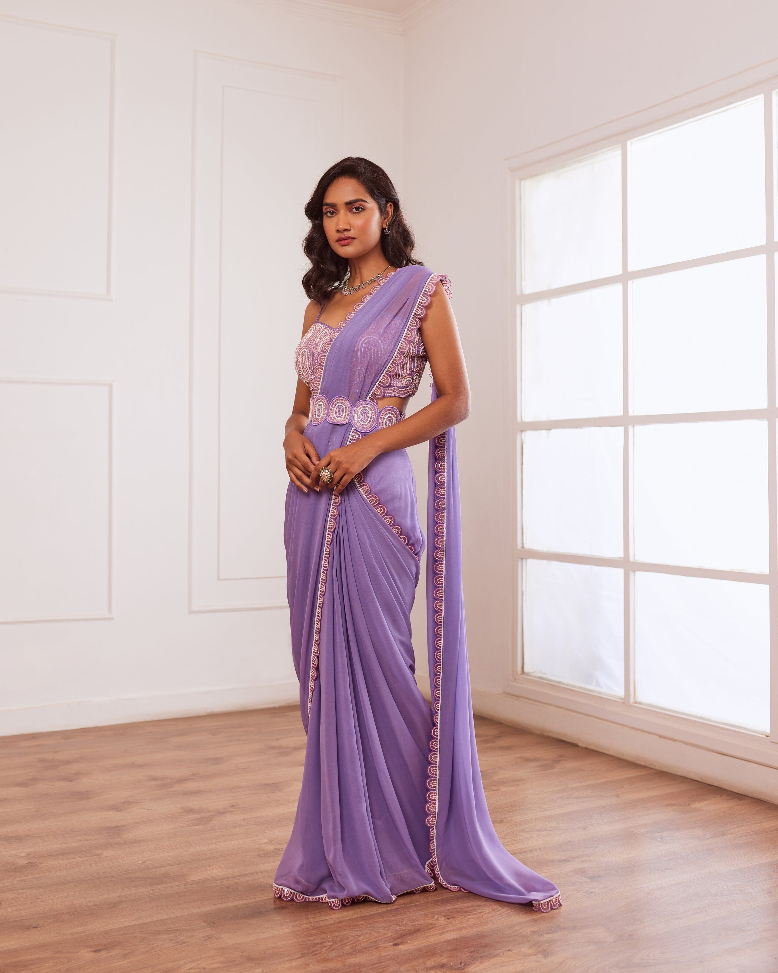 Lavender embellished blouse with pre draped saree having hand embroidered border and detatchable belt.