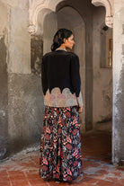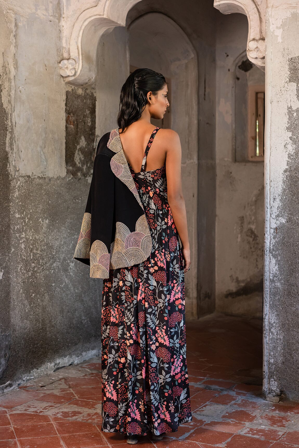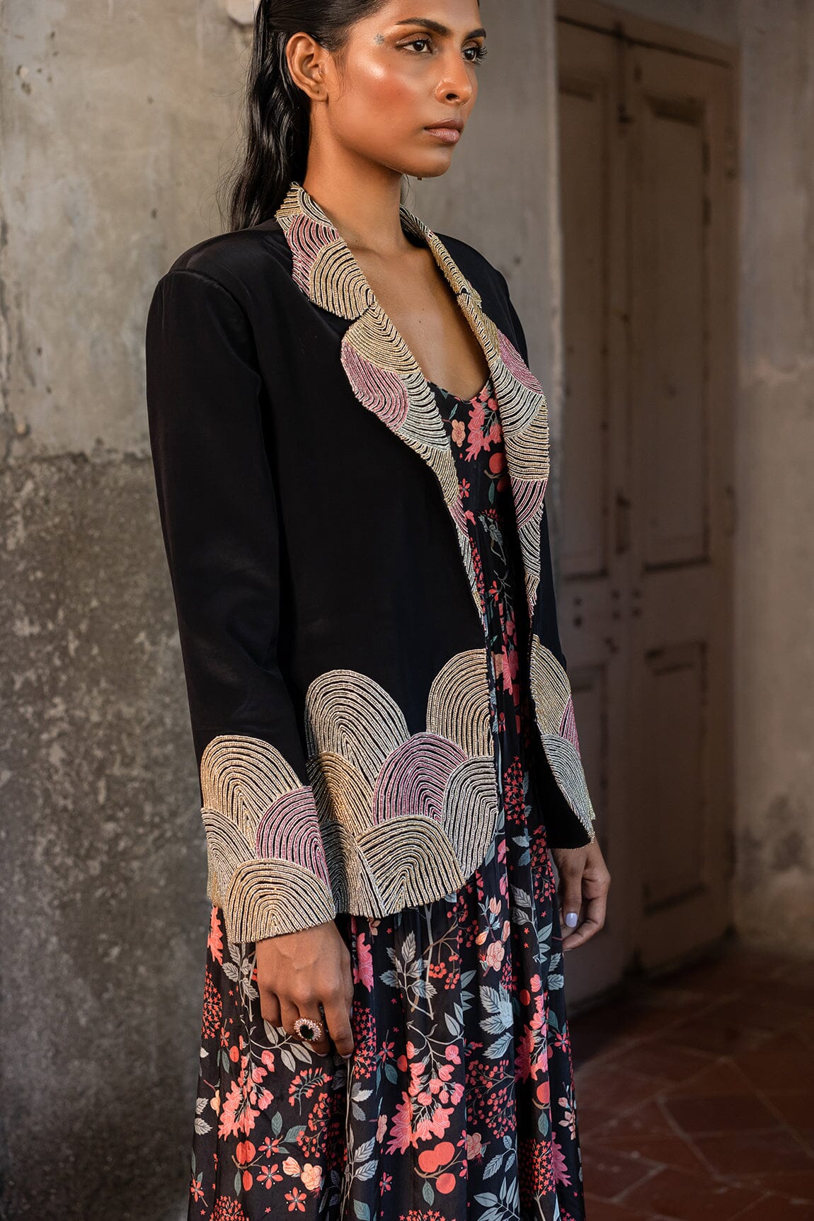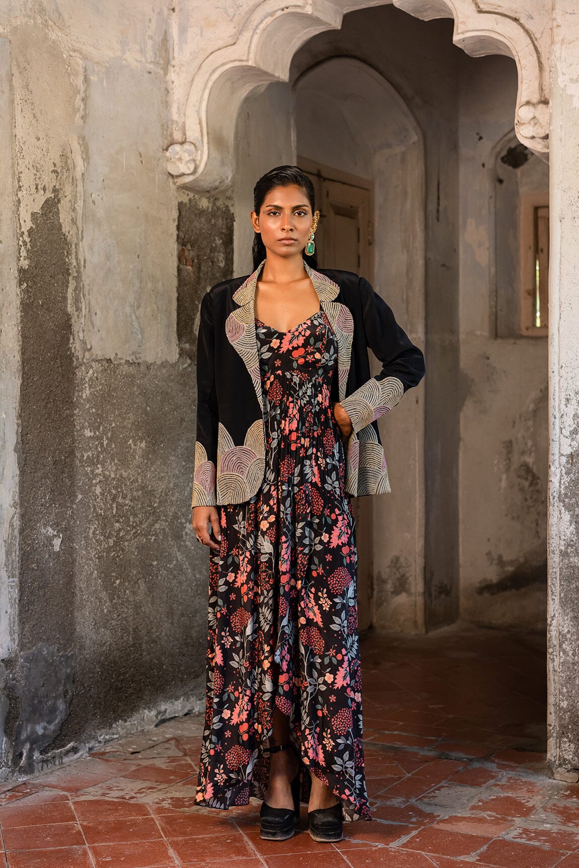 A long dress with a floral jungle print is paired with a black blazer embellished with gold thread and small beads. A long dress with blazer.