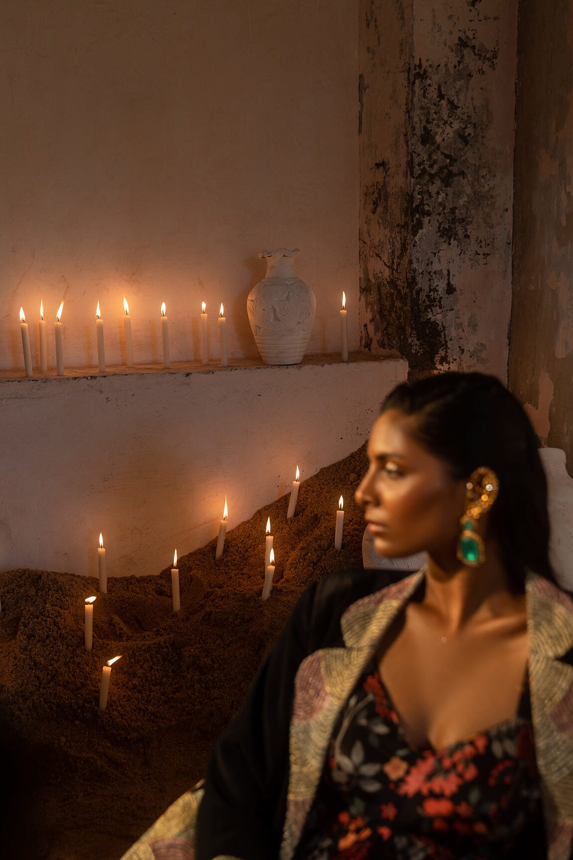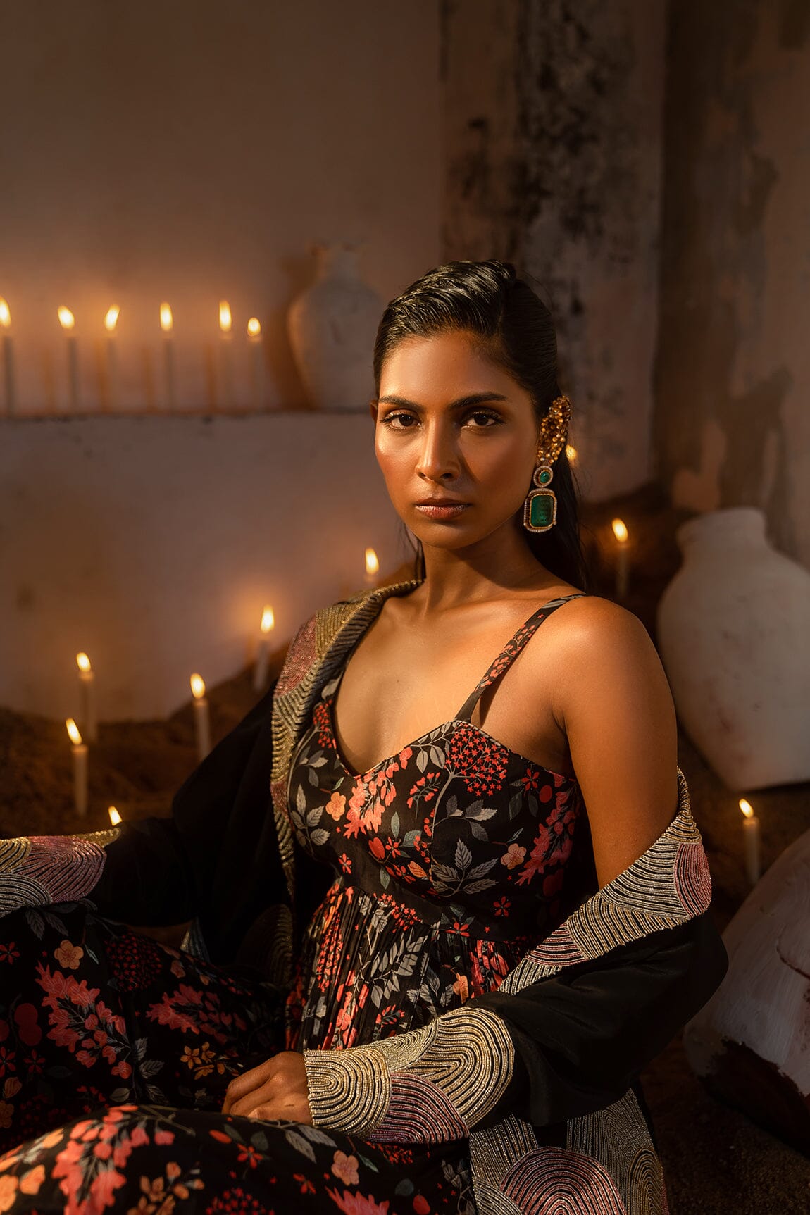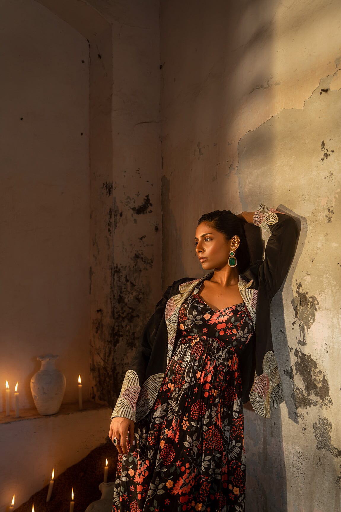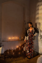 A long dress with a floral jungle print is paired with a black blazer embellished with gold thread and small beads. A long dress with blazer.