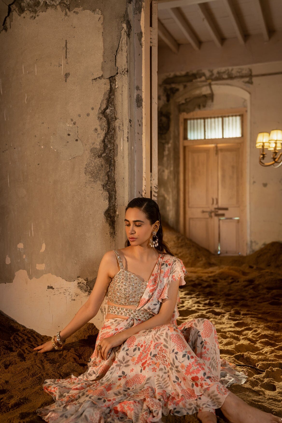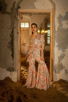 This outfit consists of a pre-draped sharara saree paired with a hand-embroidered blouse and styled with a belt.A pre-draped sharara saree paired with hand embellished bustier and belt.