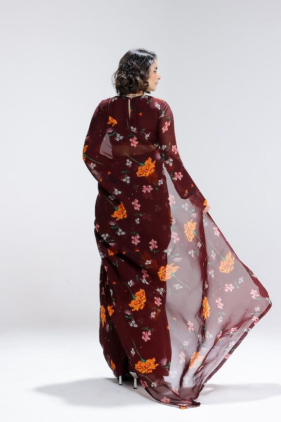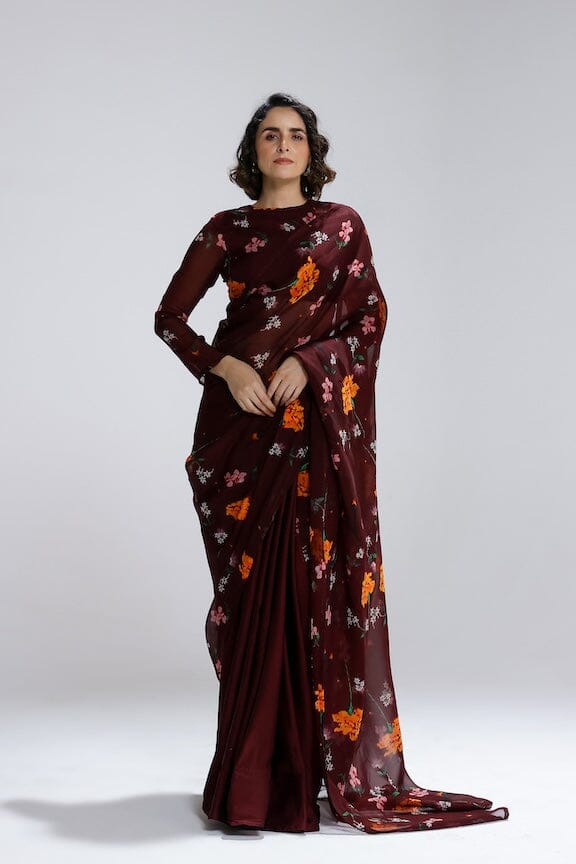 Celebrate summer weddings with the vibrant “GARLANDS” organza saree. Featuring beautiful reds, a pre-pleated saree, and a hand-contrasting burgundy pleated skirt, this three-piece ensemble blends elegance with playful summer florals. Perfect for festive occasions, it offers effortless style and flattering silhouettes.