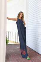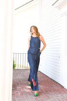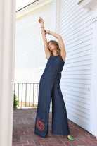 Denim is all the rage this season, and our relaxed fit jumpsuit is the perfect example. Made to feel breezy and amazing on a sunny day, this jumpsuit is adorned with contemporary paisley embroidery at the bottom. The front pleat, secured with a leather buckle, cinches the waist to give your body a flattering shape. Ideal for a brunch outing, style it with color block heels and a clutch to make a statement.