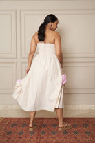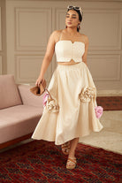 This cropped bustier top features delicate stripes, thin spaghetti straps, and fabric-covered buttons down the front. The back features a delicate tie detail making it very feminine. Paired with the high-waisted, A-line skirt and multiple striped pastel rosettes. The voluminous silhouette and elastic waistband combine elegance with comfort.
