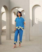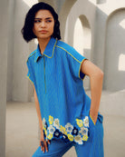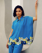 The Blue Sylvie shirt has short sleeves and a regular collar. It comes in a striped pattern with delicate floral detailing and sequins at the hemline.