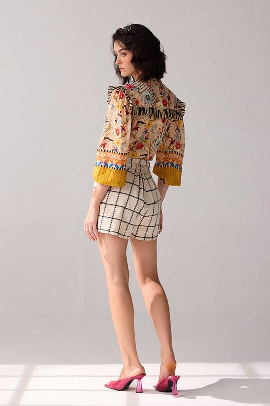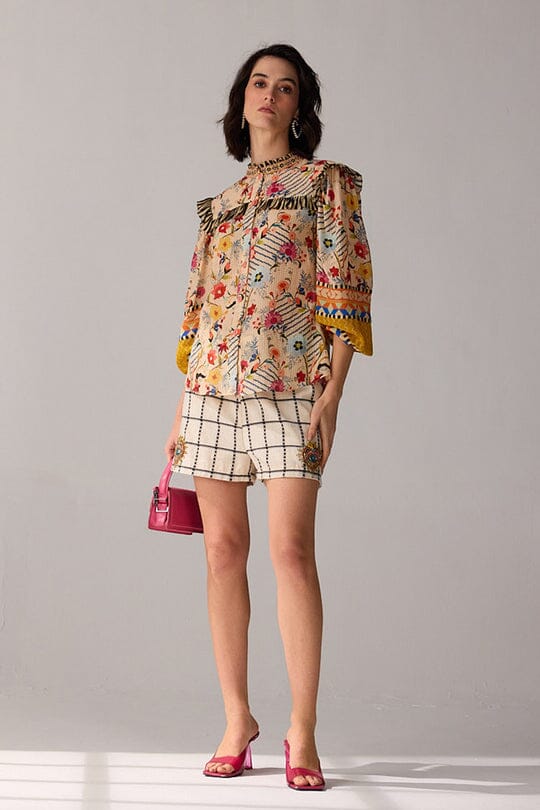 This chic co-ord set features a printed blouse with an intricately embroidered border along the neckline, paired with cotton shorts adorned with playful heart-shaped eye threadwork.