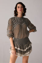 Add a chic twist to your wardrobe with our checkered printed blouse, accented with delicate lace detailing.