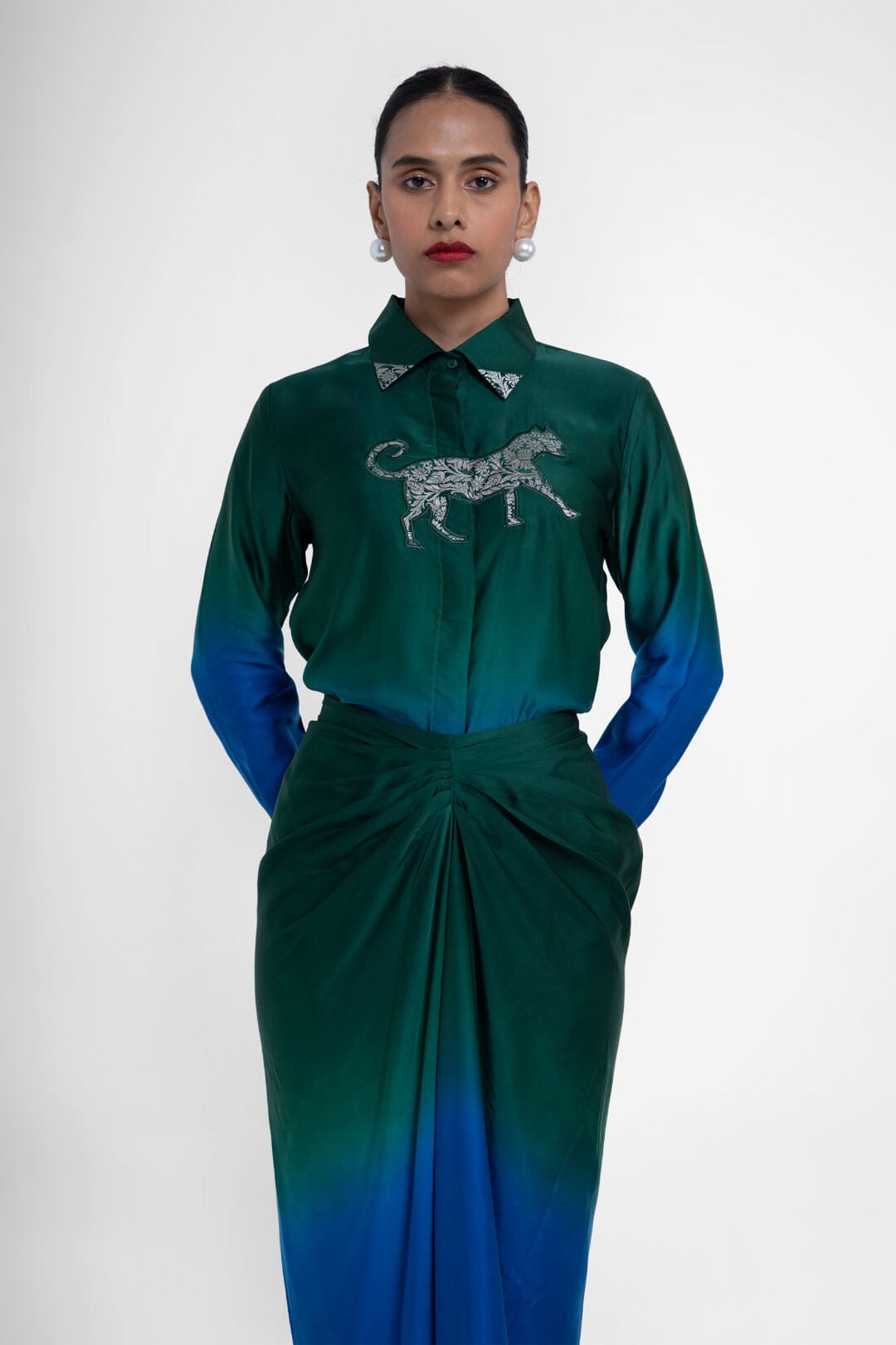 The shirt has a Banarasi tiger appliqué in green, which makes it strikingly beautiful and unique.