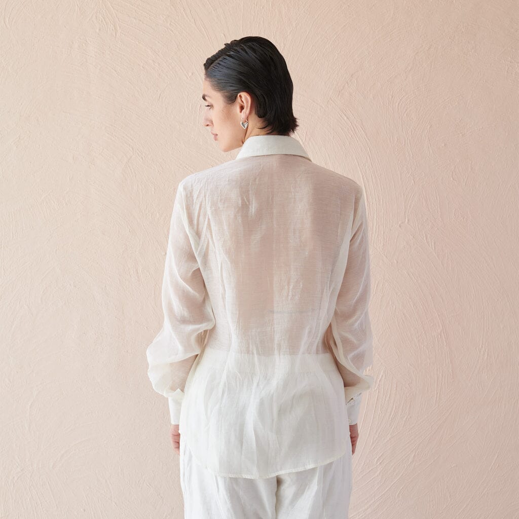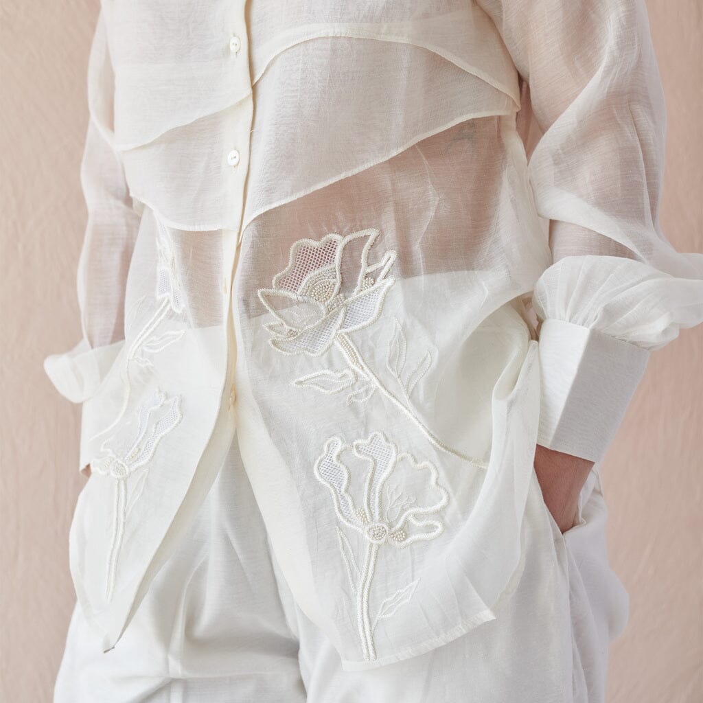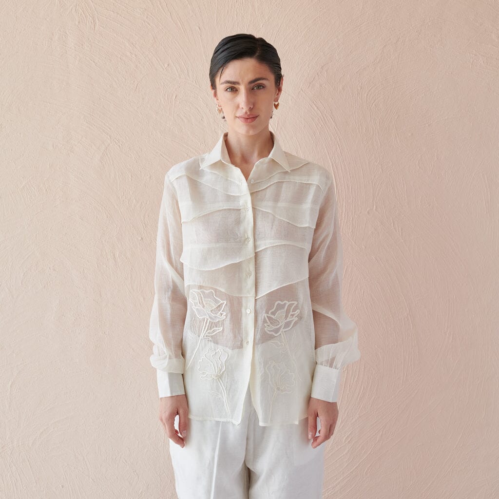 Crafted in airy, semi-sheer Chanderi, this full-sleeved shirt flows with layered waves of fabric that add quiet movement and dimension. Thoughtful thread and bead embroidery bloom across the front, catching the light with every shift.