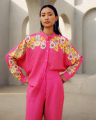 The Pink Chloé Kimono shirt has a mandarin collar and is made of double georgette with a striped pattern. It features floral embroidery and sequins on the neckline and sleeves.