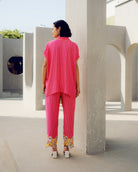 The Pink Sylvie shirt has short sleeves and a regular collar. It comes in a striped pattern with delicate floral detailing and sequins at the hemline.