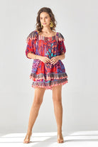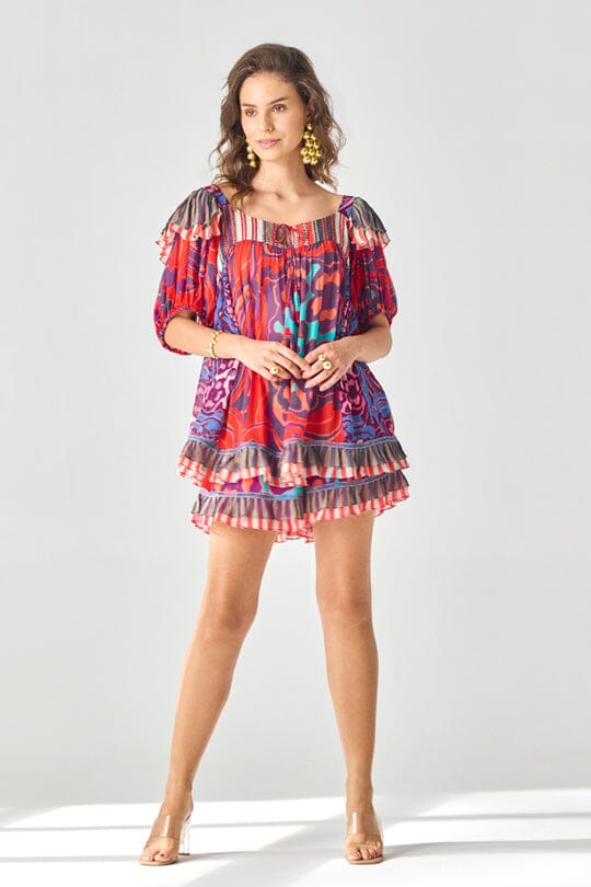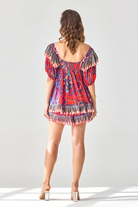 A versatile printed blouse in viscose georgette that combines delicate thread work with charming ruffle and lace detailing.